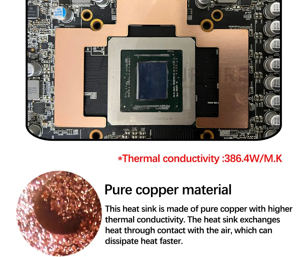 3.La conductividad térmica y la disipación de calor de la tarjeta gráfica fabricada es cobre puro, con una conductividad térmica de 386,4W/M.K.