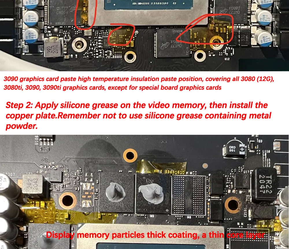 Aplique grasa de silicona a la memoria de vídeo y luego instale la placa de cobre.Aplique grasa de silicona a la placa de cobre y a la CPU para instalar el disipador de calor.
