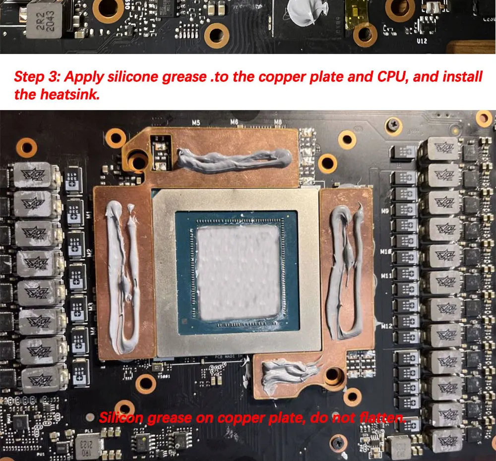Aplique grasa de silicona a la memoria de vídeo y luego instale la placa de cobre.Aplique grasa de silicona a la placa de cobre y a la CPU para instalar el disipador de calor.