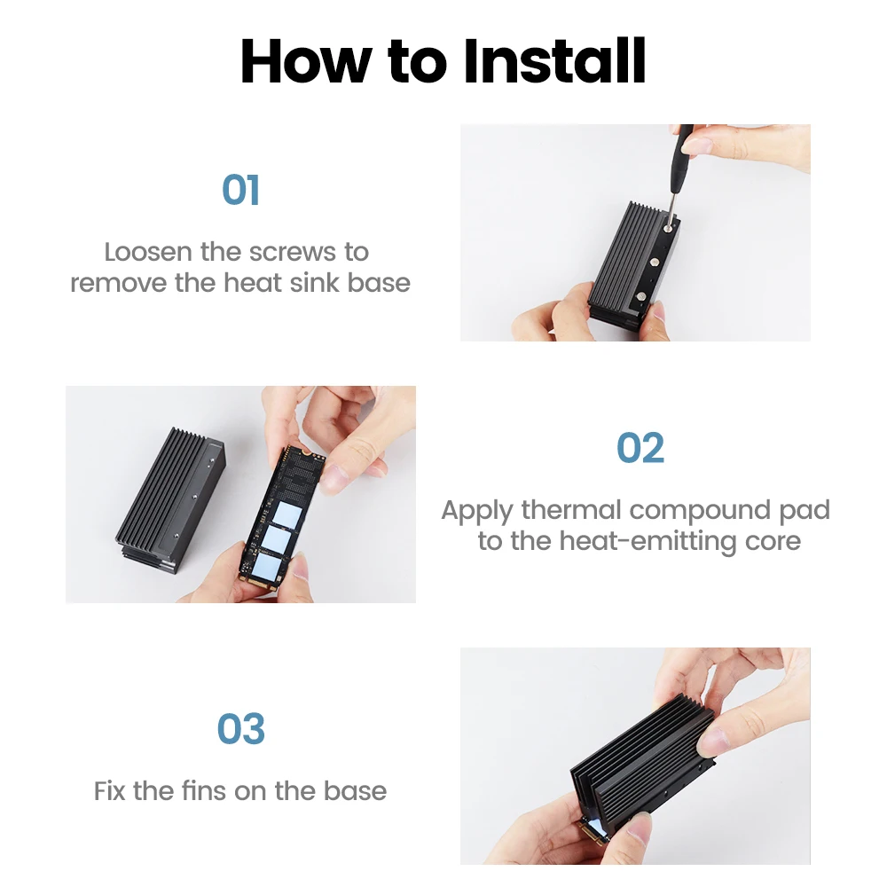 3. The heat sink has a screw-fixed frame and included two high-conductivity thermal compound pads that can fill the contact gap of the SSD. When the screws are tightened, the heat dissipation of the SSD will be faster, and the soft thermal compound pads can make the solid heat sink base gently touches the SSD without damaging it