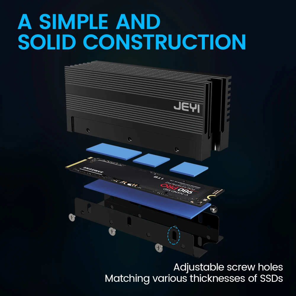 4. Support all types of M.2 SSD ( NVME SSD and NGFF SATA SSD ). Tightening the screws and stick the thermal pad on the chips and the back, it will works, especially for the Samsung 980 EVO series which is really hot. According to JEYI's experiment, it can be reduced At least 10°C-30°C