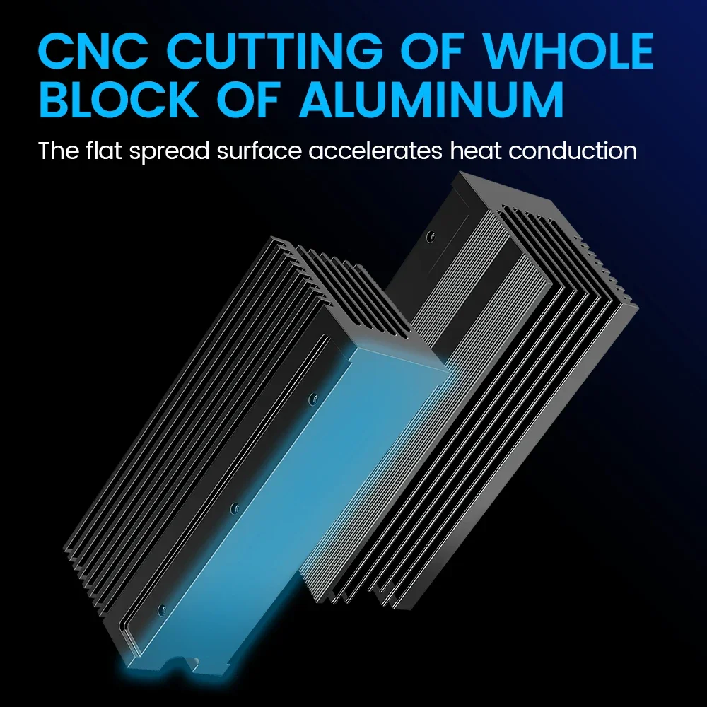 3. The heat sink has a screw-fixed frame and included two high-conductivity thermal compound pads that can fill the contact gap of the SSD. When the screws are tightened, the heat dissipation of the SSD will be faster, and the soft thermal compound pads can make the solid heat sink base gently touches the SSD without damaging it