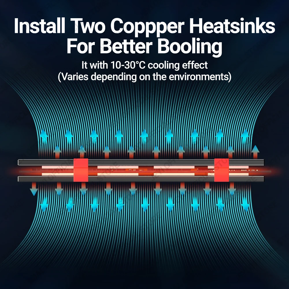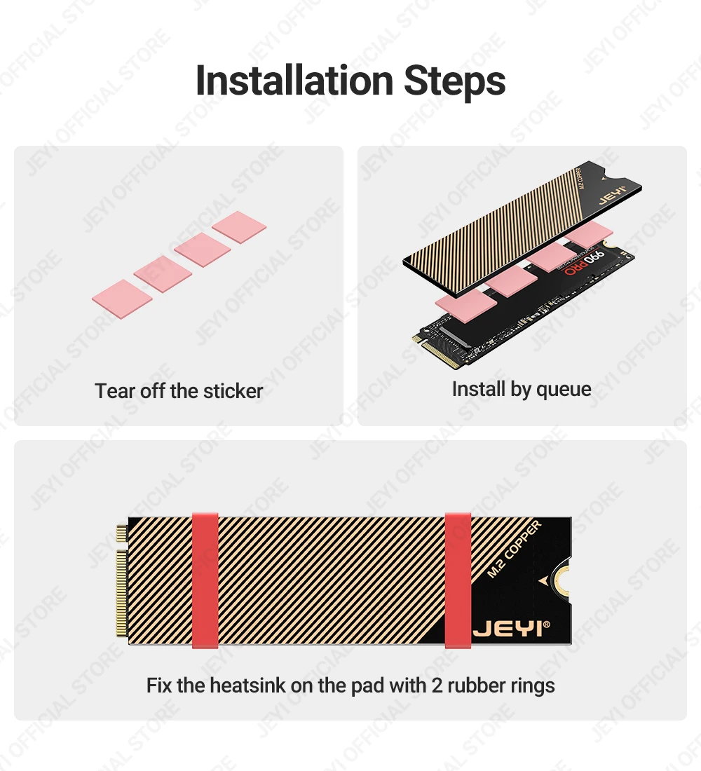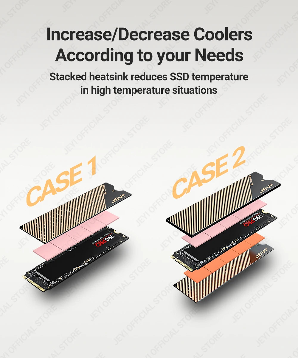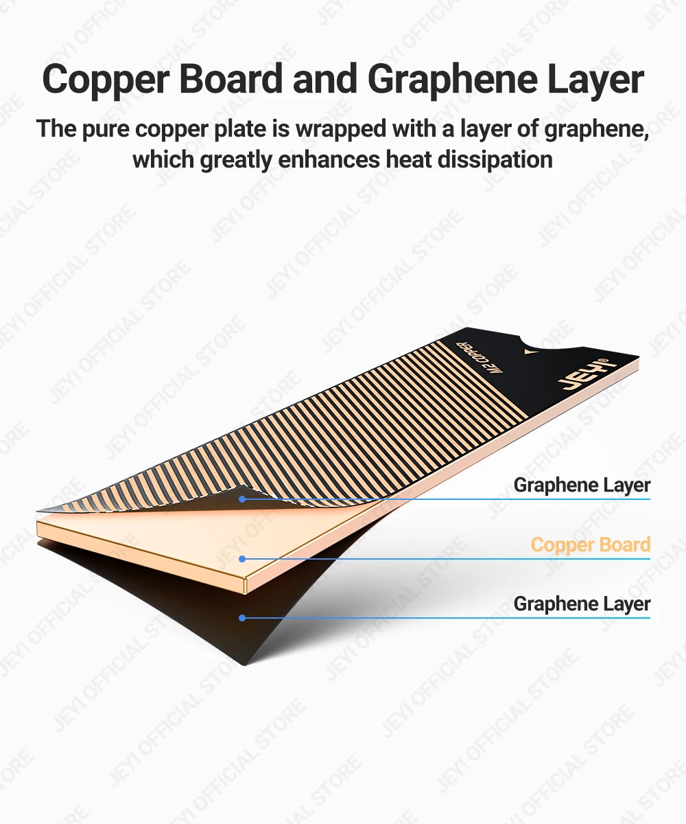 Los radiadores JEYI cuentan con cobre de alta pureza (401 W/mk) como material central, superando la conductividad térmica del aluminio puro (237 W/mk).Esto garantiza una transferencia de calor superior, manteniendo su SSD fresco incluso bajo cargas de trabajo pesadas.
