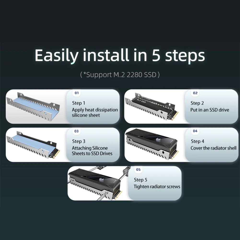 4.Compatibilidad universal:Este disipador de calor para disco duro admite una amplia gama de SSD, lo que simplifica la instalación y maximiza la eficiencia de enfriamiento entre diferentes dispositivos.