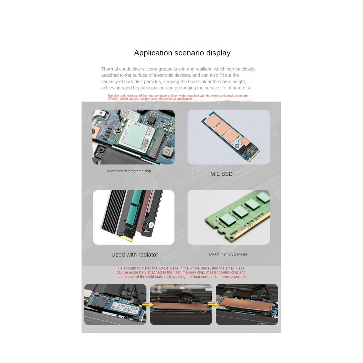 3. Con almohadilla de silicona conductora térmica: la grasa de silicona conductora térmica es suave y flexible, combinada con almohadilla de silicona conductora térmica de alto rendimiento, que puede ajustarse firmemente a la superficie de los dispositivos electrónicos. También puede rellenar los huecos en las partículas del disco duro, manteniendo las aletas de disipación de calor a la misma altura, logrando una rápida disipación del calor y extendiendo la vida útil del disco duro.