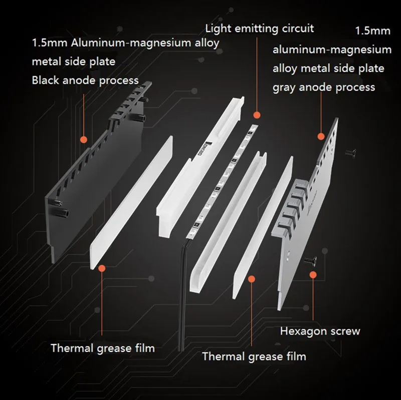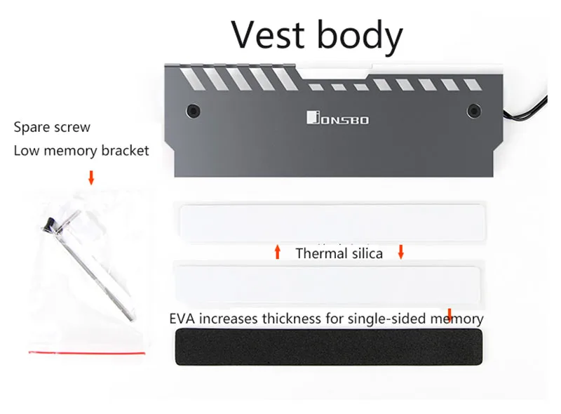 Modelo: Edición (RGB)Color: Color gris oscuro/negroEspecificación: 2 PCS/BoxDimensión: 141MM (W) * 8,5 MM (D) * 43MM (H)Material: aluminio + ABSVoltaje: 12V DCConector: 1*4 pinesPeso: 114gClasificación de color: edición RGB (compatible con placa base AURA)Realice el efecto de monocromático fijo, circulación multicolor, respiración, parpadeo, etc.Sin embargo, no se pueden lograr efectos de mezcla multicolor;Objeto aplicable: enfriador de memoria de escritorioCaracterísticas de la edición (RGB):A. Conéctese a la placa base y los colores son controlados por AURA.B. Hay 2 piezas de grasas de silicona conductoras térmicas en el interior para ayudar a la disipación de calor de RAM.C. Admite RAM de lado (s) alto/bajo y simple/doble.D. Ambos lados están hechos de aleación de aluminio y magnesio con proceso de trefilado de ánodo.E. El pequeño conector de alimentación estándar de 3 pines se proporciona con conexión en serie compatible.JONSBO Marcas Embalaje 2 piezas (Accesorio 2 Juegos)Lista de embalajeChaleco de enfriamiento de memoria * 2Pasta térmica * 4Grosor de aumento EVA (para memoria de chip de un solo lado) * 2Bolsa de accesorios de instalación de repuesto * 2Manual de instrucciones * 1Caja de embalaje de marcas JONSBO * 1