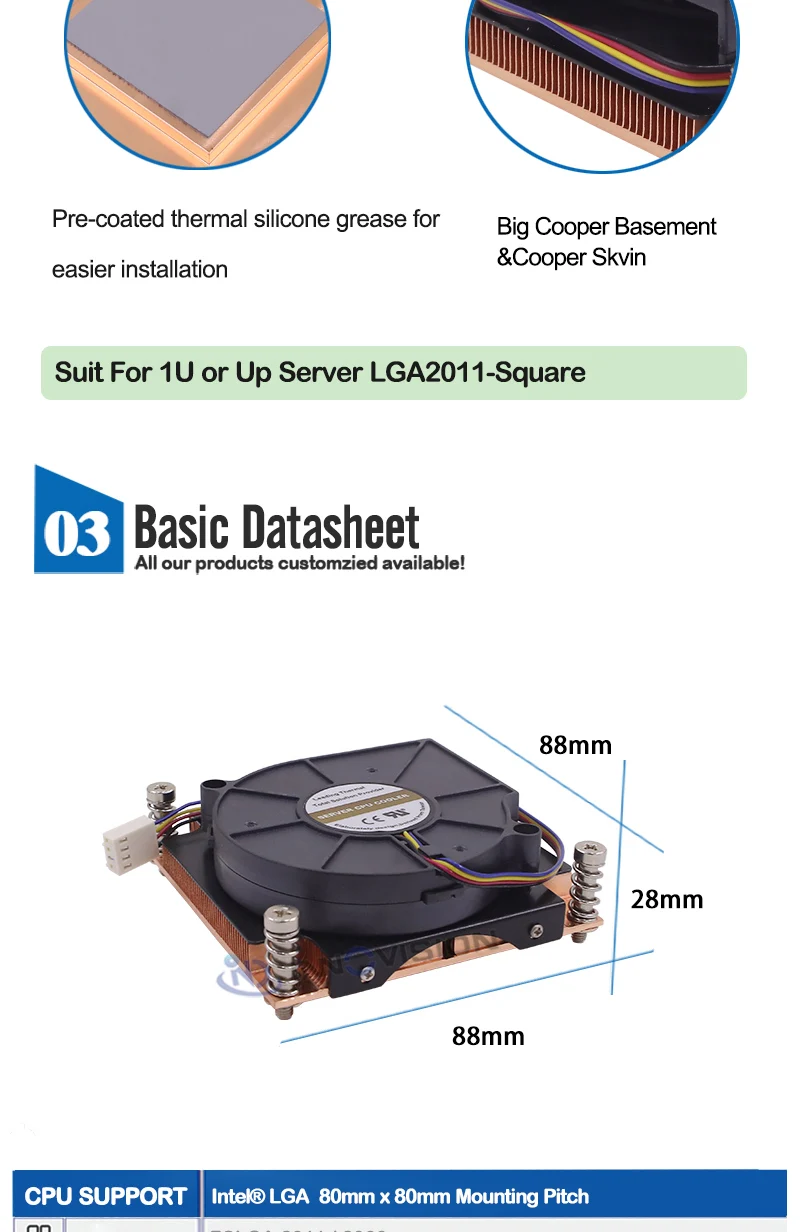 Disipador de calor de servidor 1U para LGA2011, enfriador de CPU LGA 2011 2066 con ventilador de 8015MM, TDP de hasta 120W, paso de montaje de 80MM, forma cuadrada, nuevo