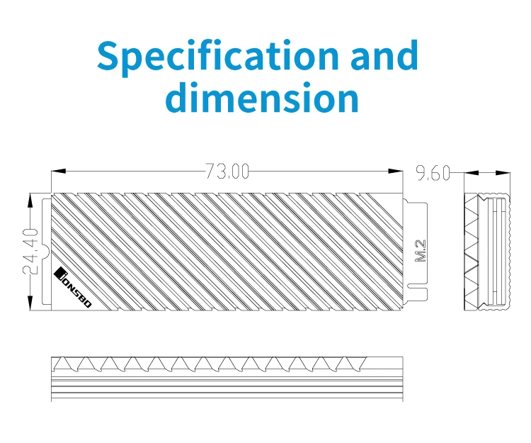 1.Jateado totalmente de aluminio + ánodo, con 45° estructura de guía de viento inclinada, se adapta mejor al conducto de aire del chasis, elimina rápidamente el calor del SSD, el tamaño mini brinda una mejor compatibilidad