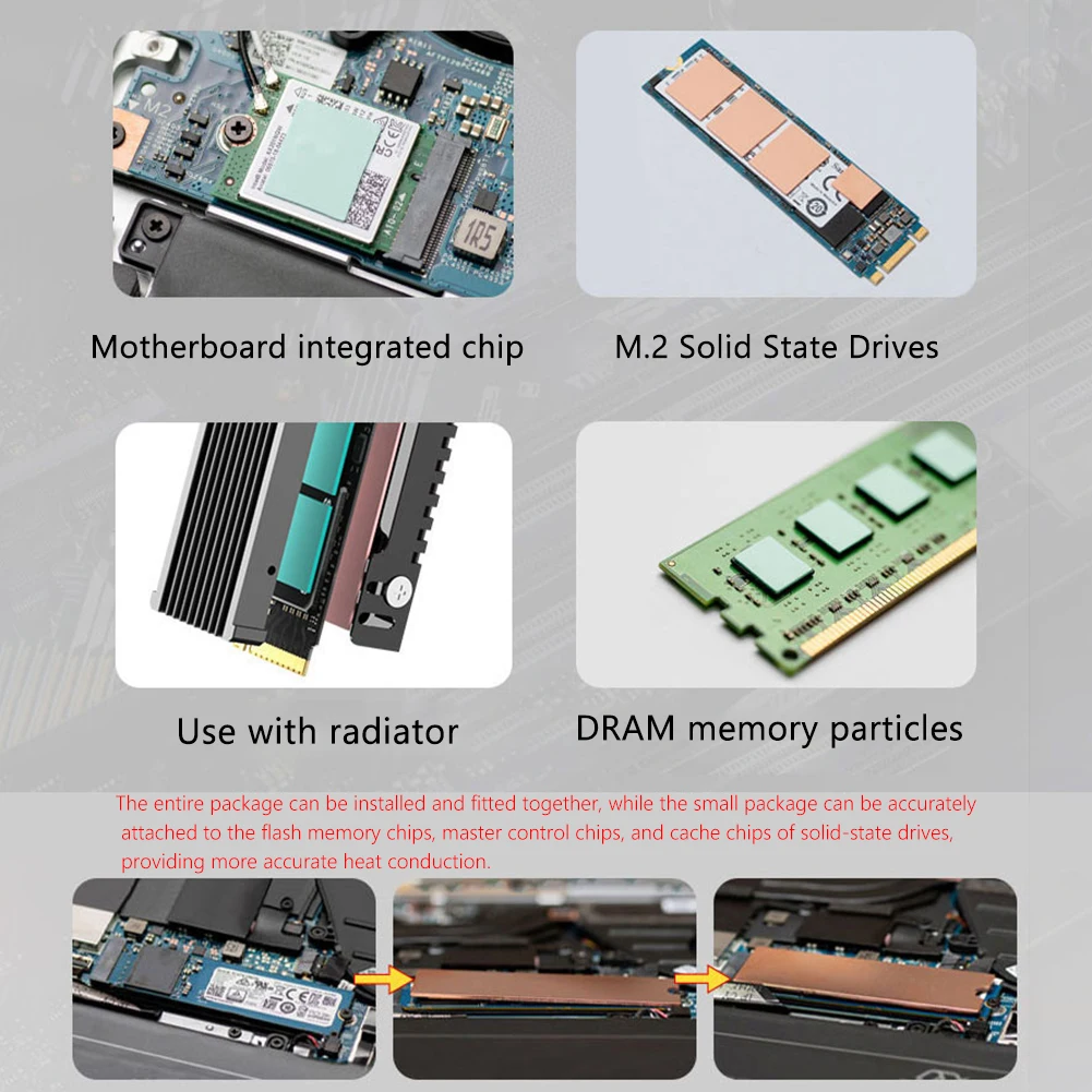 3.Hazlo tú mismo:Se pueden combinar diferentes tamaños y espesores de obleas de silicio termoconductoras con paquetes completos y pequeños, según las aplicaciones reales, como los chips integrados de la placa base, M.2 unidades de estado sólido, disipadores de calor, partículas de memoria DRAM, etc.Todo el paquete se puede instalar y montar en conjunto.El paquete pequeño se puede conectar con precisión a los chips de memoria flash, chips de control maestro y chips de caché de las unidades de estado sólido, lo que proporciona una conducción de calor más precisa.
