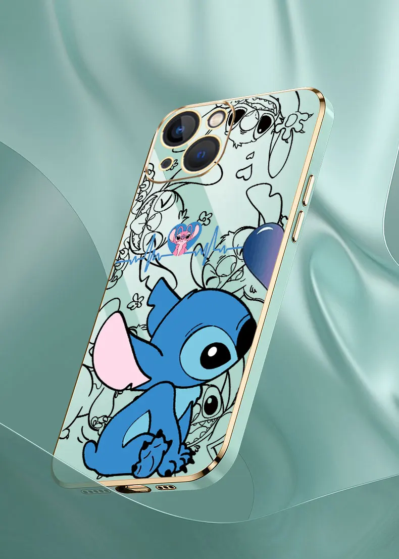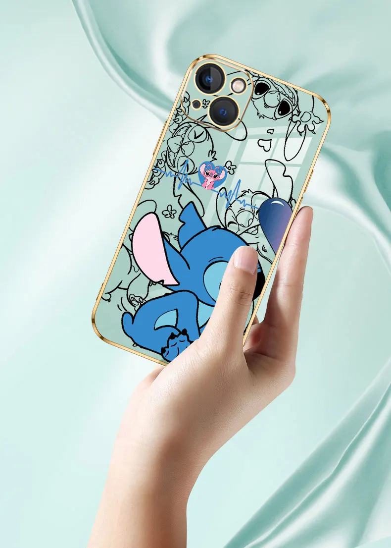 Disney Love Lilo Stitch Ángel ParejaFunda para Apple iPhone 15 14 Pro Max 13 12 Mini 11 7 8 Pro XSMax X XR SE Funda de teléfono de lujo con borde dorado