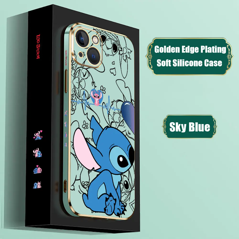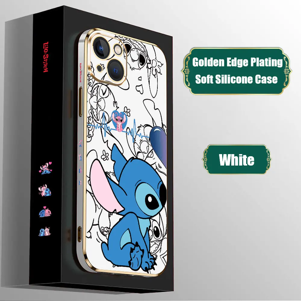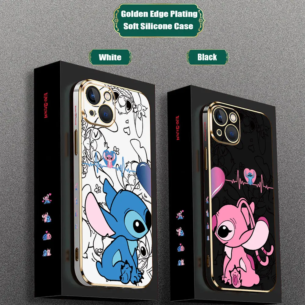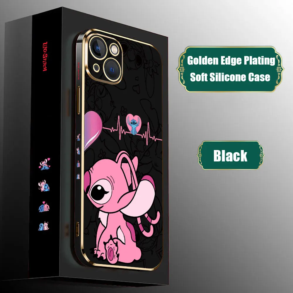 Disney Love Lilo Stitch Ángel ParejaFunda para Apple iPhone 15 14 Pro Max 13 12 Mini 11 7 8 Pro XSMax X XR SE Funda de teléfono de lujo con borde dorado