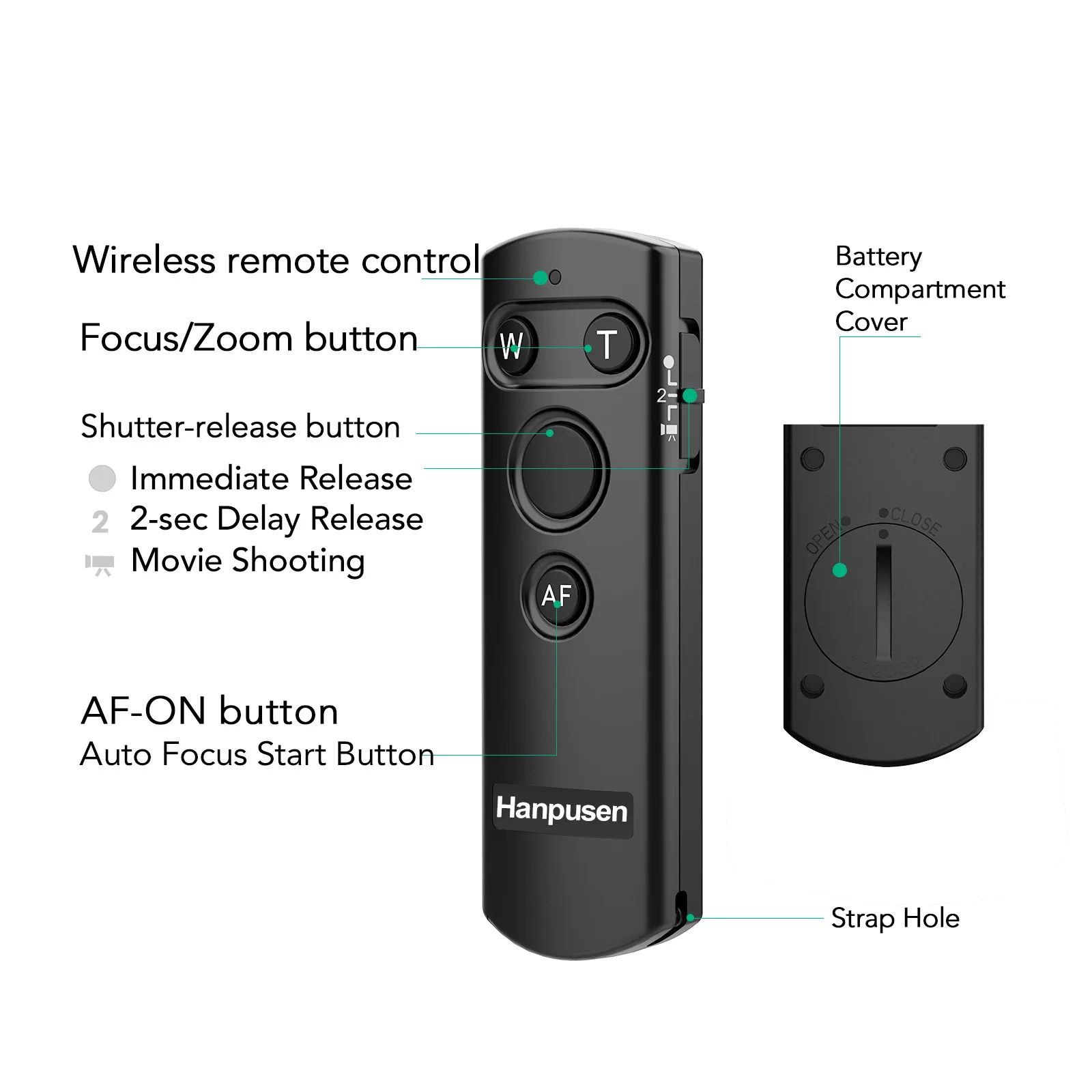 El BR-E1B HANPUSENEl control remoto inalámbrico está especialmente diseñado para cámaras Canon seleccionadas.Le permite controlar su cámara de forma inalámbrica con una distancia operativa de aprox.10 m/32,8' en cualquier dirección.El BR-E1B se puede utilizar para tomas instantáneas, tomas con retraso de 2 segundos, grabación de vídeo, enfoque con AF y zoom*.El control remoto es portátil y puedes guardarlo en tu bolsillo o colgarlo en tu llavero.Funciona con una batería CR2032 (incluida).HANPUSEN BR-E1B reemplaza completamente el control remoto inalámbrico Canon BR-E1.