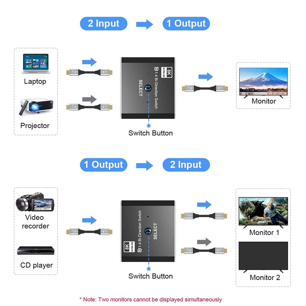 【Modo dual】 Uno en dos salidas: un ordenador conectado a dos monitores, (Nota: dos monitores no se pueden mostrar al mismo tiempo, y (conectando dos fuentes, un monitor), solo se puede conectar a un monitor, no se puede cambiar entre los monitores); Salida 2 en 1: Dos ordenadores conectados a un monitor, (Nota: al cambiar al ordenador A, el monitor muestra el contenido del ordenador A; al cambiar al ordenador B, el monitor mostrará el contenido del ordenador B).