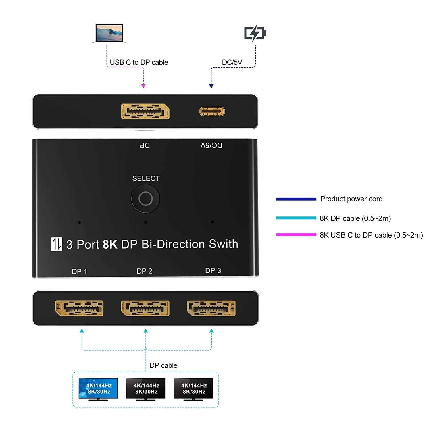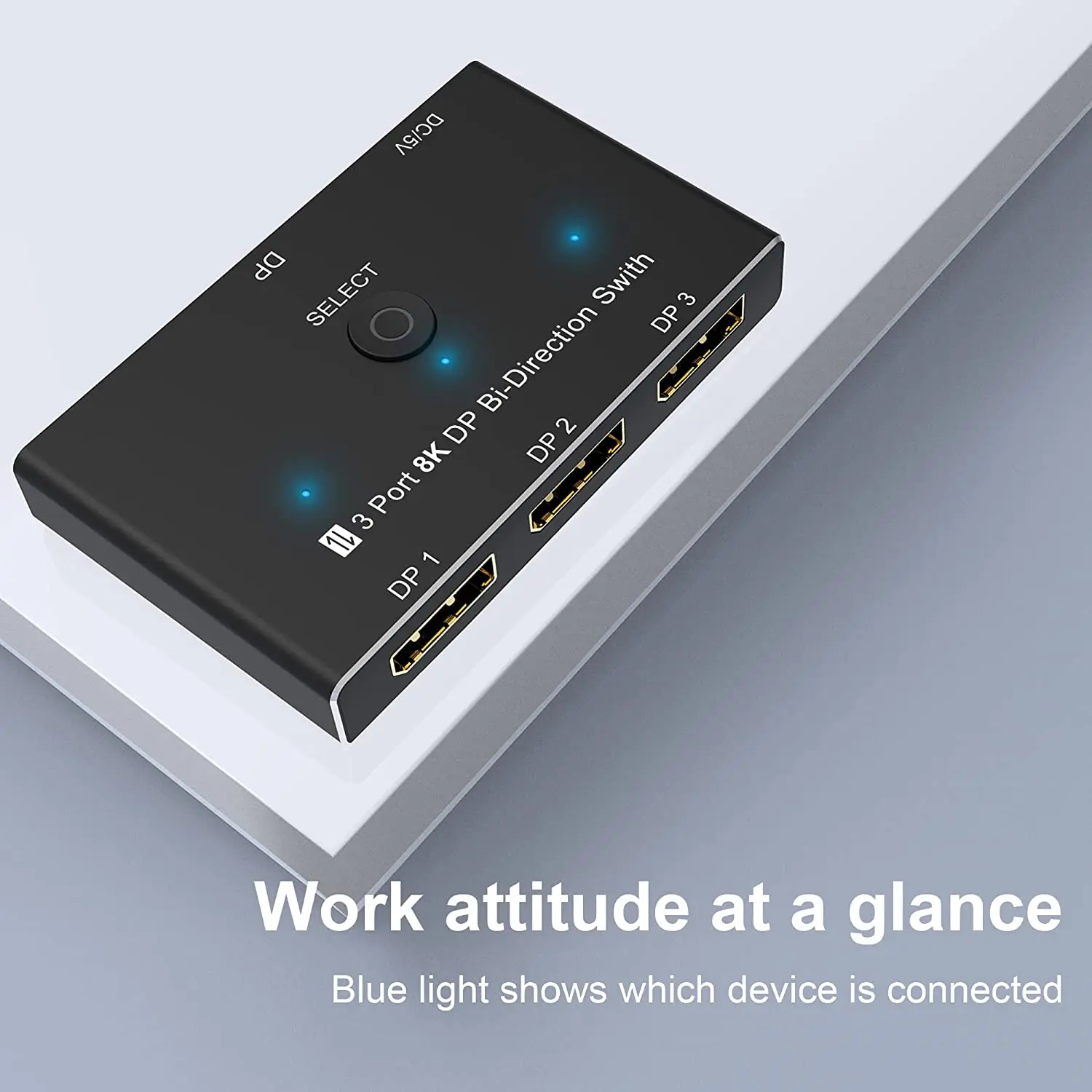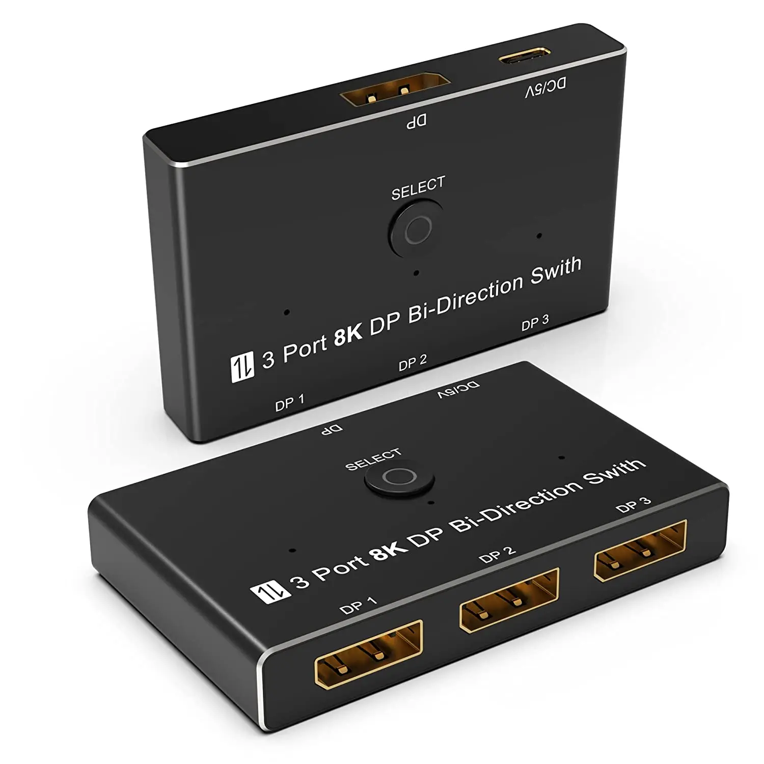 Comprar DisplayPort 8K DP 1,4 interruptor 3in 1Out 1In 3Out bidireccional 8K @ 30Hz 4K @ 144Hz, convertidor divisor para múltiples fuentes y pantallas