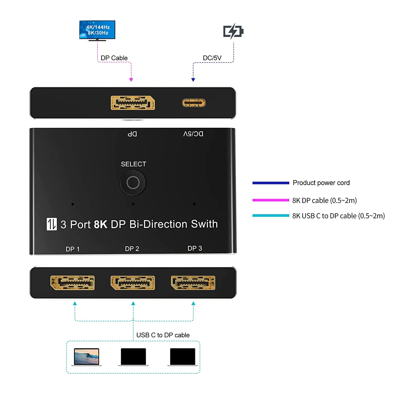 Conmutador DP bidireccional: el conmutador DisplayPort le permite conectar tres fuentes DP a una pantalla DP o conectar una fuente DisplayPort para alternar entre tres pantallas. (Tres pantallas NO pueden mostrarse simultáneamente, presione el botón "Seleccionar" para cambiar entre tres pantallas). £ ¨Mientras se conecta a Source o Display, debe usar el cable USB para alimentar el divisor, o su pantalla no podrá mostrar nada). No utilice un cable demasiado largo (3m en total) para la conexión entre el conmutador y sus dispositivos.