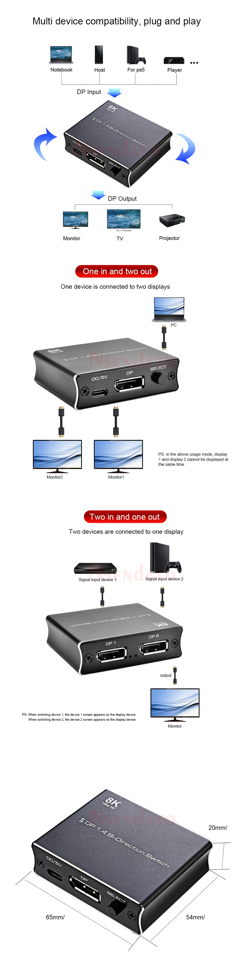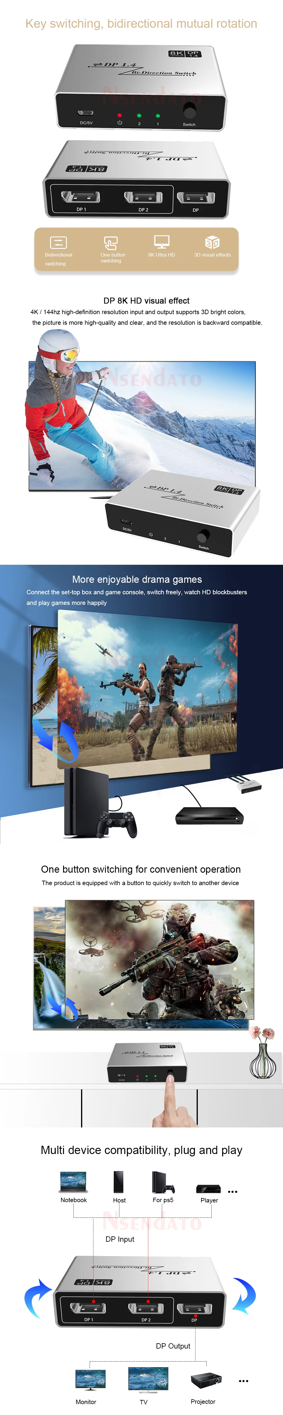 Comprar Displayport-conmutador bidireccional 2 en 1, divisor de Displayport 1,4 DP a DP 1x2 2x1 DP 8K 30Hz 60Hz 4K 120Hz, conmutador Displayport DP