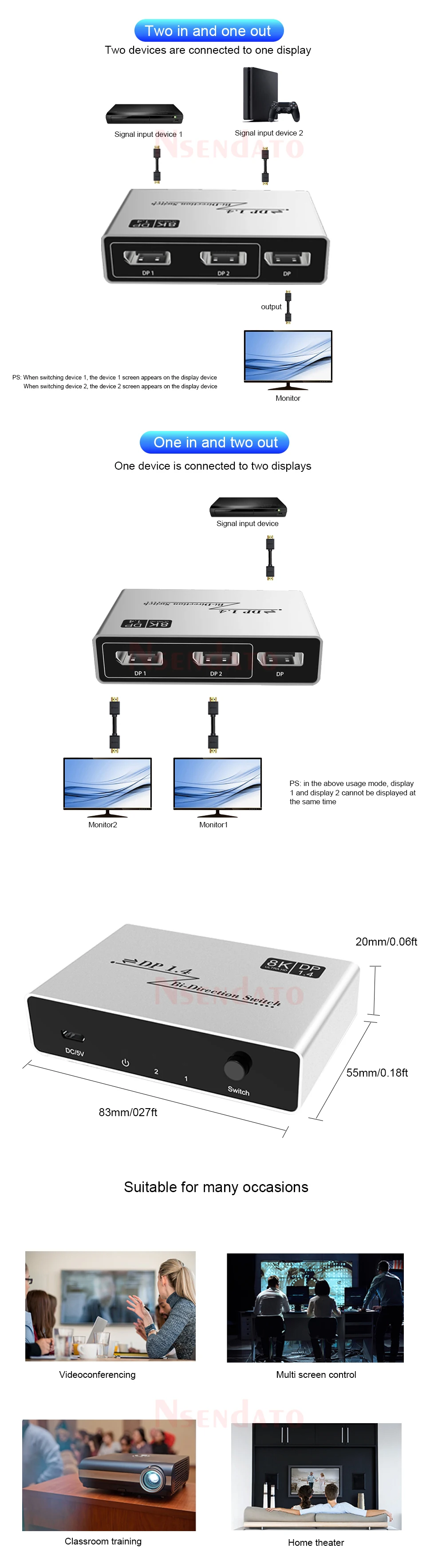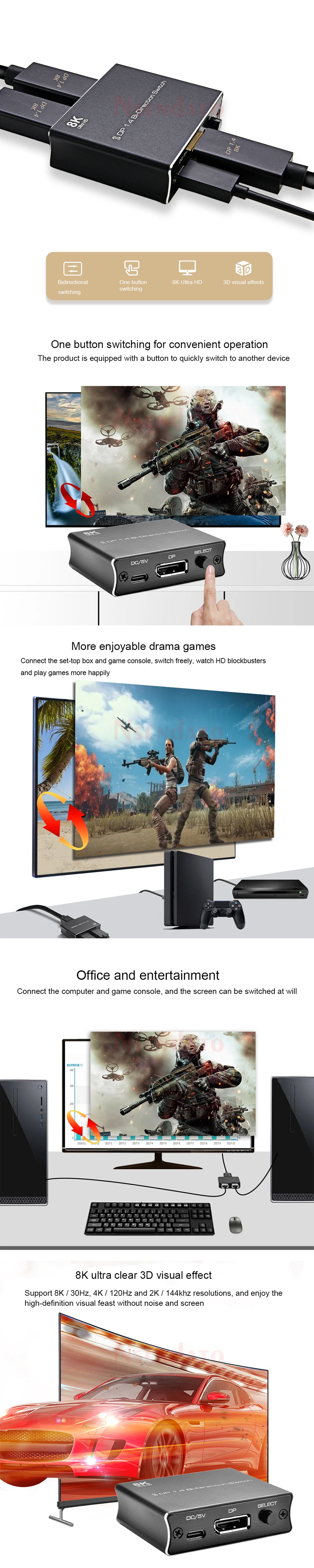 Divisor 8K DP1.4: soporta 8K @ 60Hz, 4K @ 120Hz, resolución de 1080P @ 240Hz, le proporciona tasas de transferencia de hasta 32,4G bps y retrocompatible con todos los estándares DP anteriores. (Necesita conectar el cable DP1.4 estándar para disfrutar de efectos visuales). El conmutador DisplayPort te permite conectar dos fuentes DP a una pantalla DP o conectar una fuente DisplayPort para alternar entre dos pantallas. DP a 2 * DP bidireccional de alta velocidad 32,4G bps 8K 4K DP interruptor 1,4 divisor