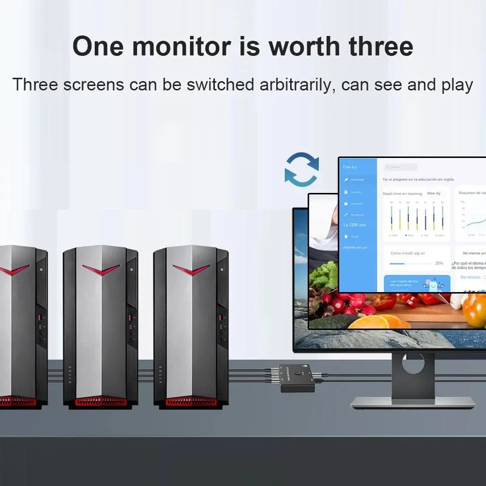 4. No utilice un cable demasiado largo (3m en total) y sus dispositivos para la conexión entre el conmutador, presione el botón "Seleccionar" para cambiar entre tres pantallas.