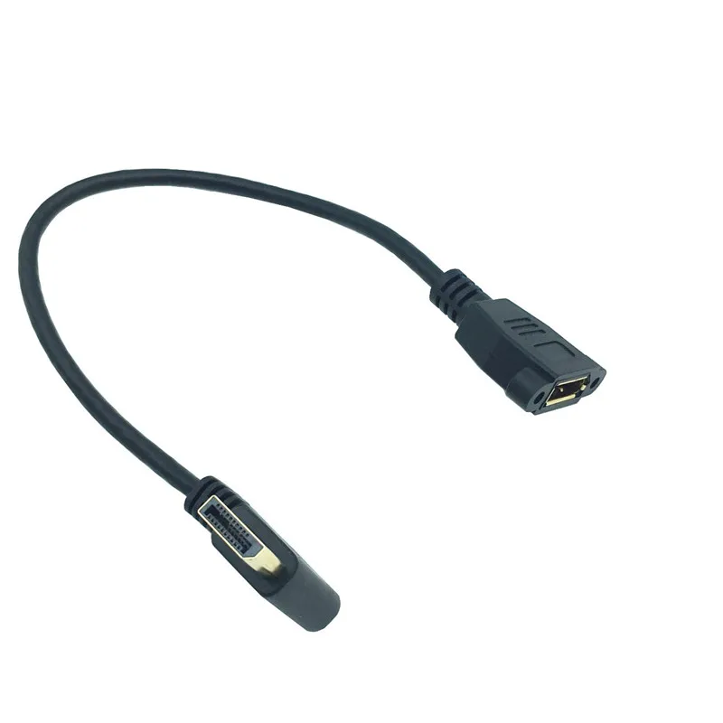 DisplayPort Male to Female 90 Degree Up & Down & Left & Right Direction Angled Extension Cable with Screw mounting hole 30cm Connect DP interface of the desktop graphics card or laptop to the display with DP interface (such as DELL U2311H, asus VE276Q, HP LE2001W, etc.) Product features: A connector : DisplayPort Female B connector : DisplayPort Male angled Cable 's length : 30cm DisplayPort v1.2 support; DisplayPort signal to DVI signal conversion is supported; DisplayPort interface that supports 20pin; Support video bandwidth up to 10.8Gbps; Maximum support QXGA 2K 4K@60Hz (2560*1600) resolution output; Support 1Mbps two-way auxiliary channel; Support one-way, single-channel, four-wire connection; Support hot plug and pull. Built-in conversion chip, no external power supply In strict accordance with DisplayPort standard design, port lock design, signal transmission is stable and reliable Applicable to: extended transmission between devices such as desktops with DP interface and devices such as TVs, monitors, projectors, etc. with DP interface; Packing include: 1 x DisplayPort Extension cable