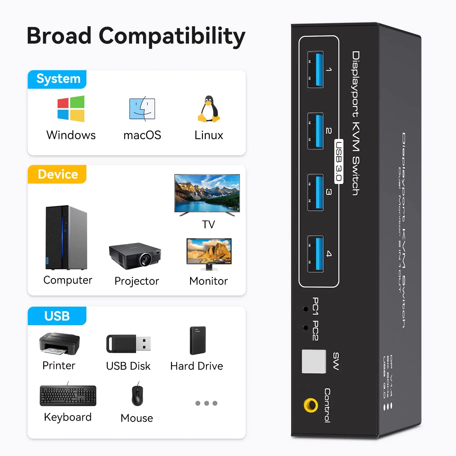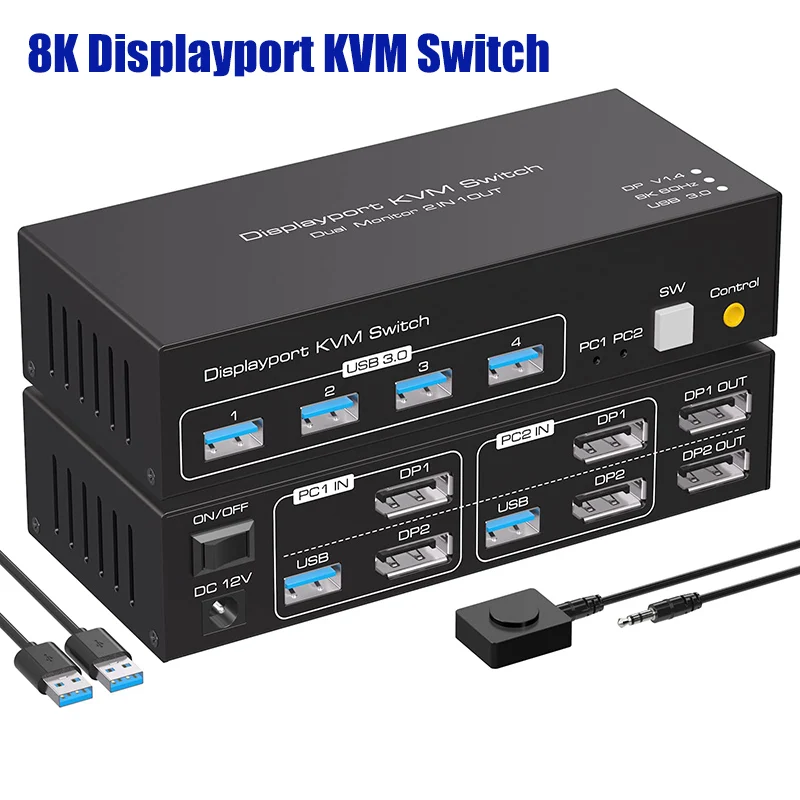 Comprar Displayport-interruptor KVM de doble Monitor, dispositivo de 8K, 4K @ 120Hz, USB 3,0, para 2 ordenadores, compartir 2 monitores y 4 dispositivos USB