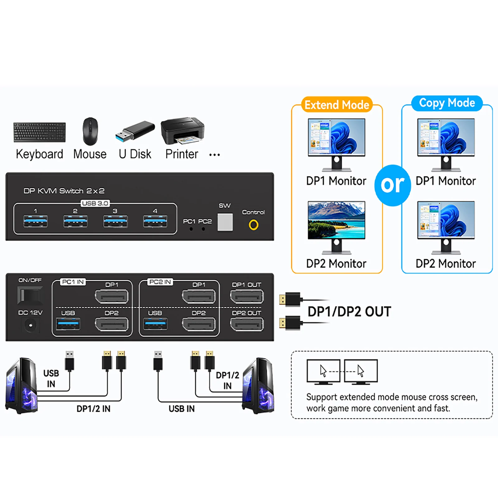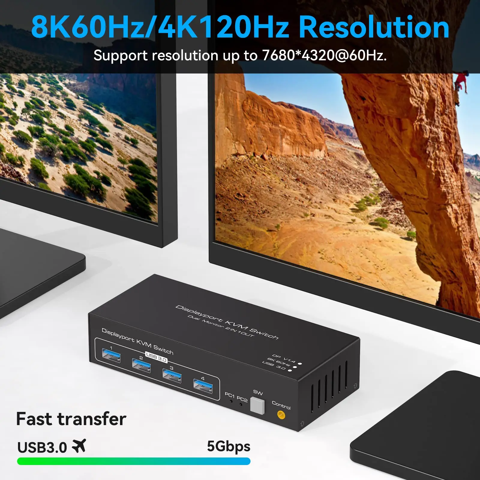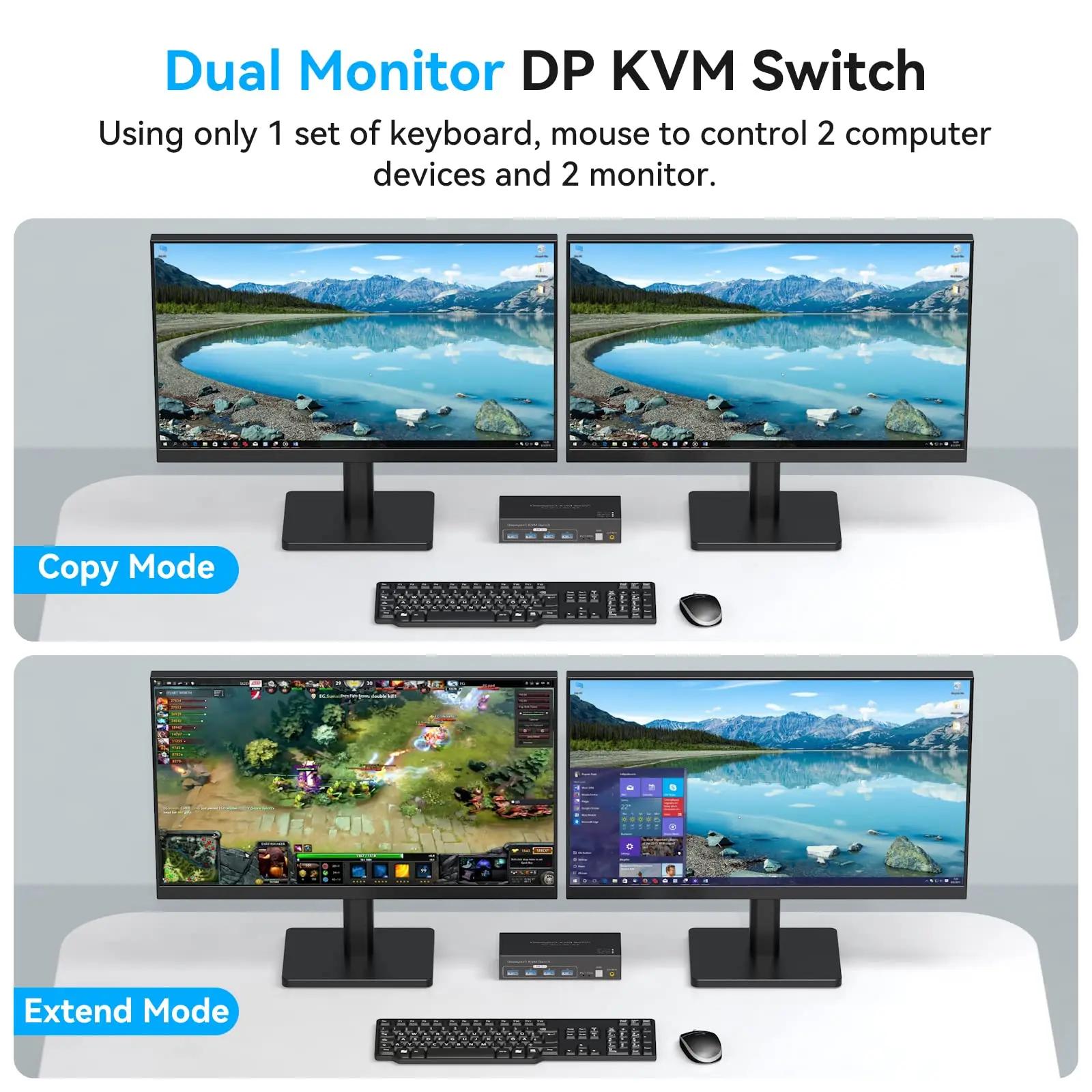 Dual Monitor Displayport 1,4 El conmutador KVM puede conectar 2 hosts de computadora que comparten 1 Juego de teclado, mouse y 2 monitores.