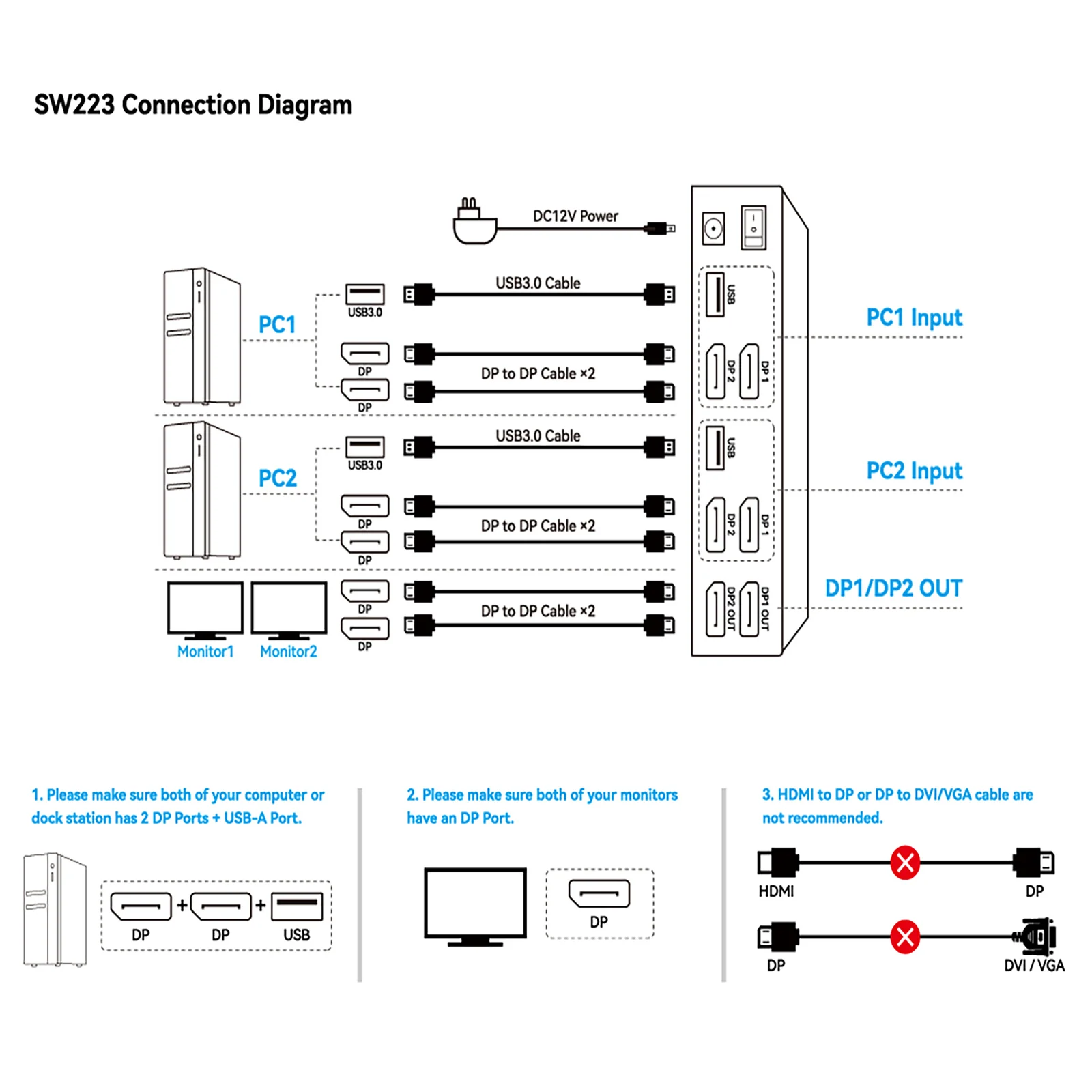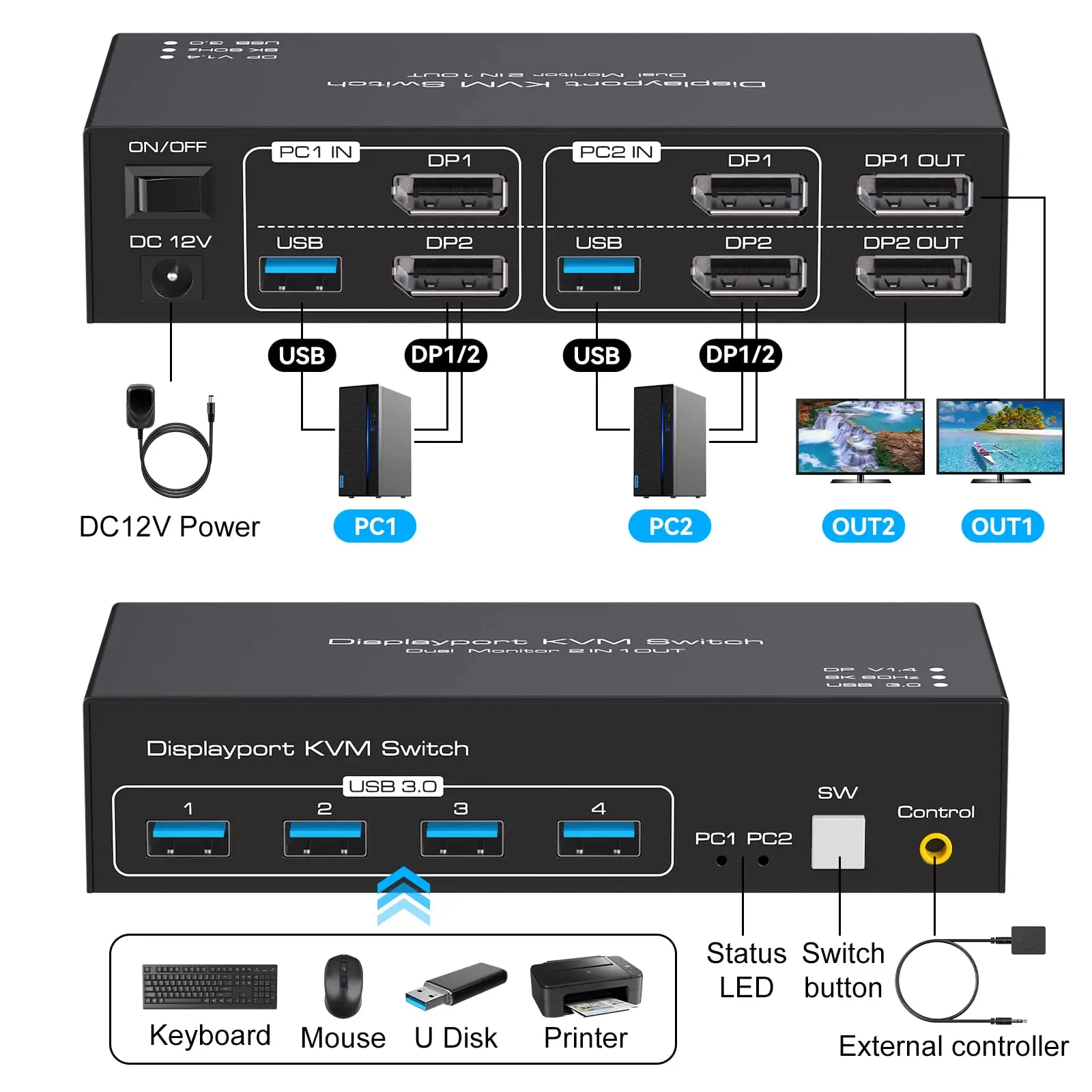 Monitor dual Displayport KVM Switch 2 ordenadores comparten 2 monitores y 4 Dispositivos USB 3,0