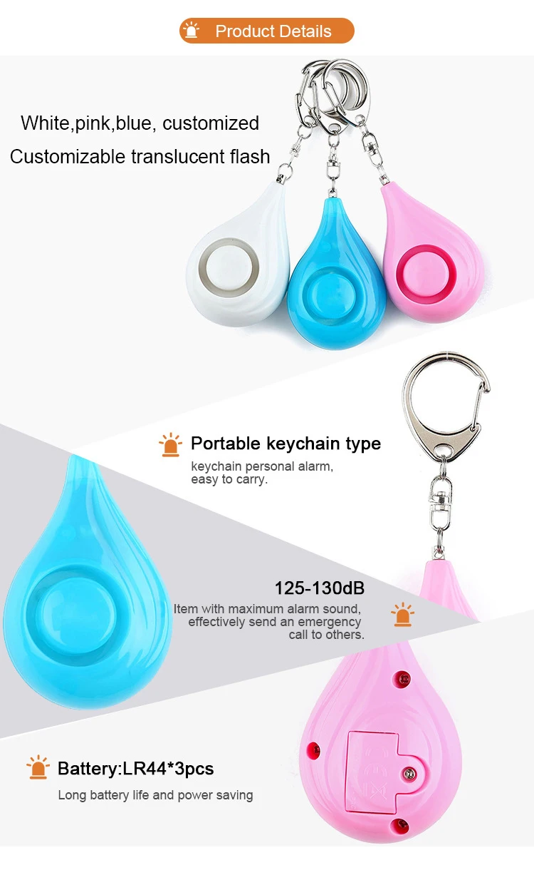 1. La nueva alarma creativa en forma de gota de agua es adecuada para personas mayores, niños y uso al aire libre. No solo para las mujeres, esta alarma también puede proteger los monederos, teléfonos móviles y objetos de valor de perderse, ser robados y robados. Su uso es adecuado para cada persona.