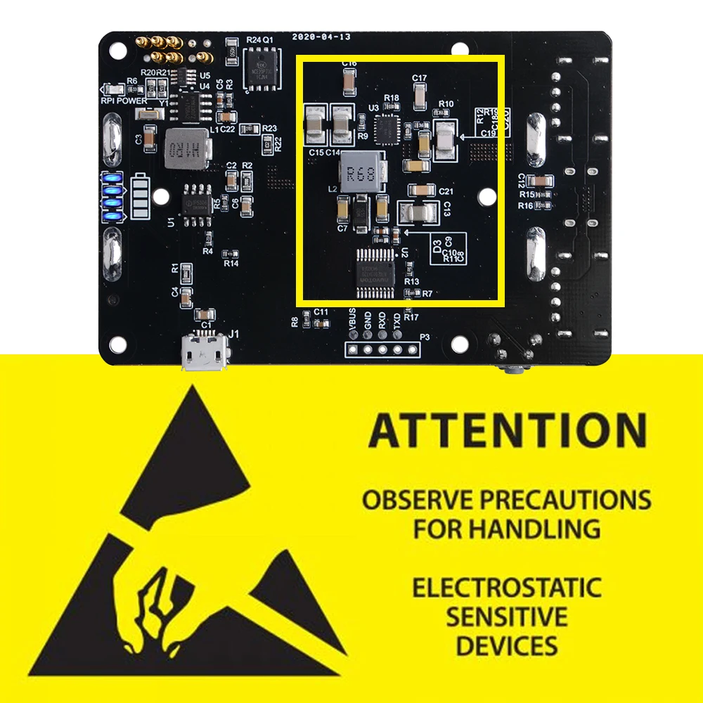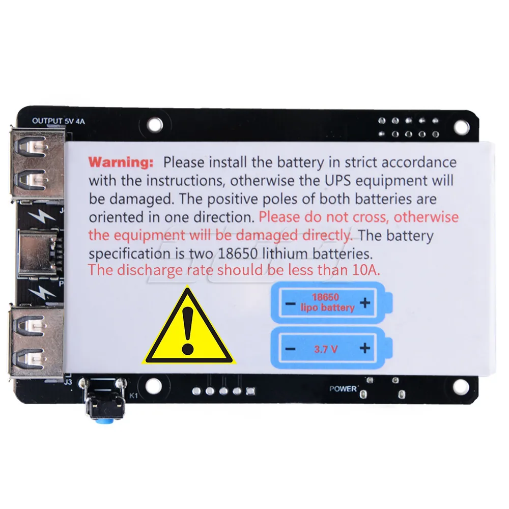 Asegúrese de que la capacidad de su adaptador de corriente pueda cubrir la carga de la batería de litio y el caso de uso de Raspberry Pi, normalmente es de 5V 3A o mejor.(Por ejemplo: la carga de la batería puede requerir hasta 2.1A, Raspberry Pi generalmente requiere 0,6-0.8A, pero hasta 2.4A, en el que si la corriente de la fuente de alimentación es inferior a 4.5A, es posible que no pueda continuar usándolo)[Advertencia ESD]
