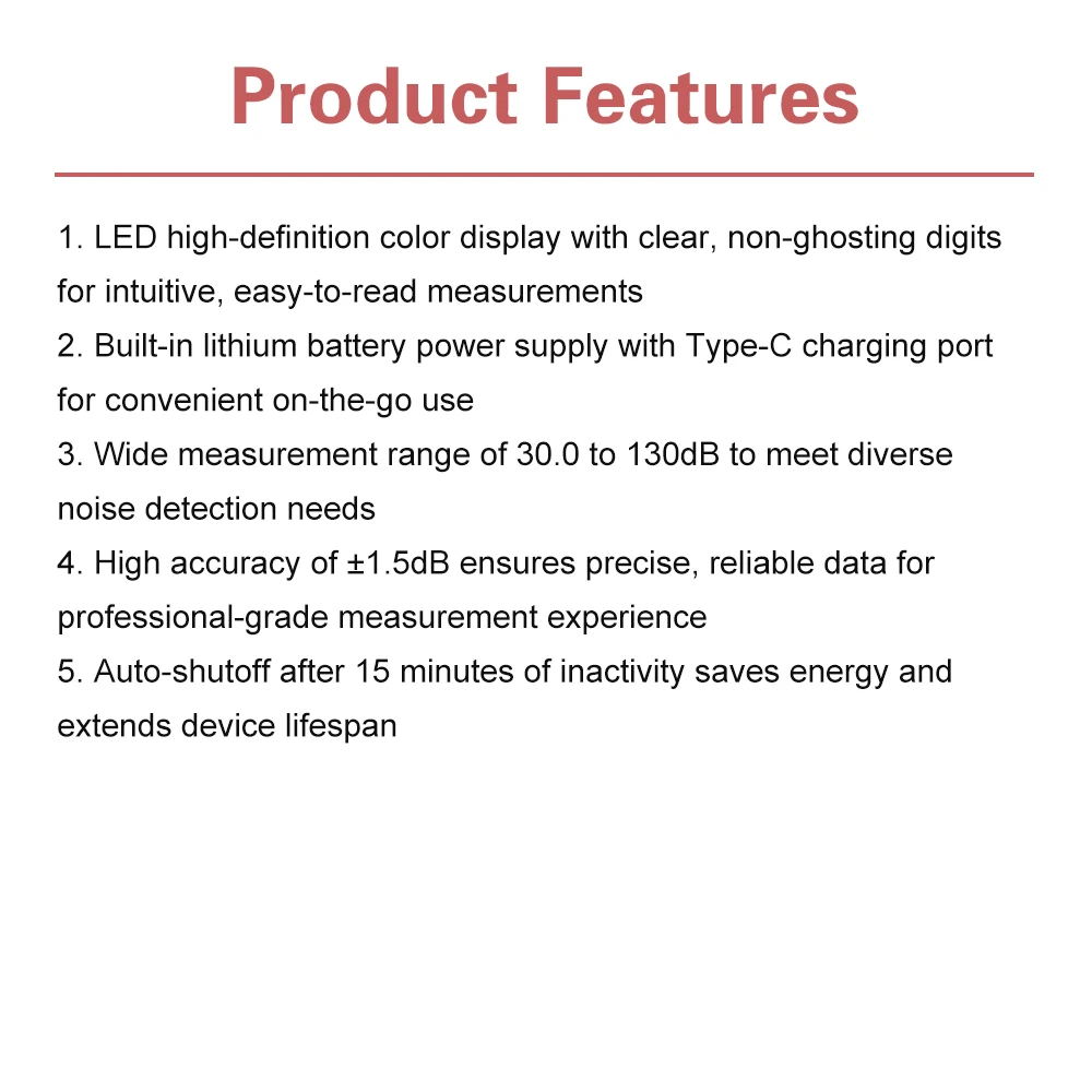4.La alta precisión de ±1,5 dB garantiza datos precisos y confiables para una experiencia de medición de nivel profesional