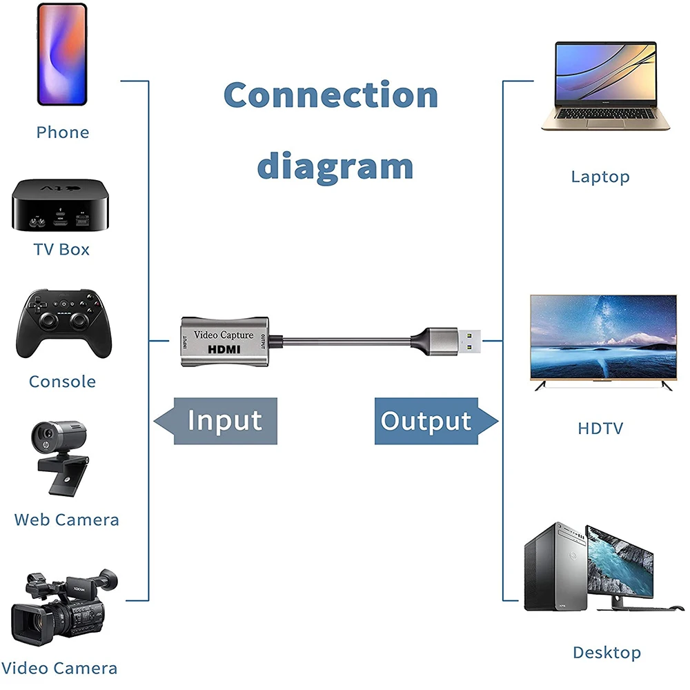 Nuestra Tarjeta de captura de video HDMI captura video y audio y transmite señales de audio y video a su computadora o teléfono inteligente para Vista previa y almacenamiento.