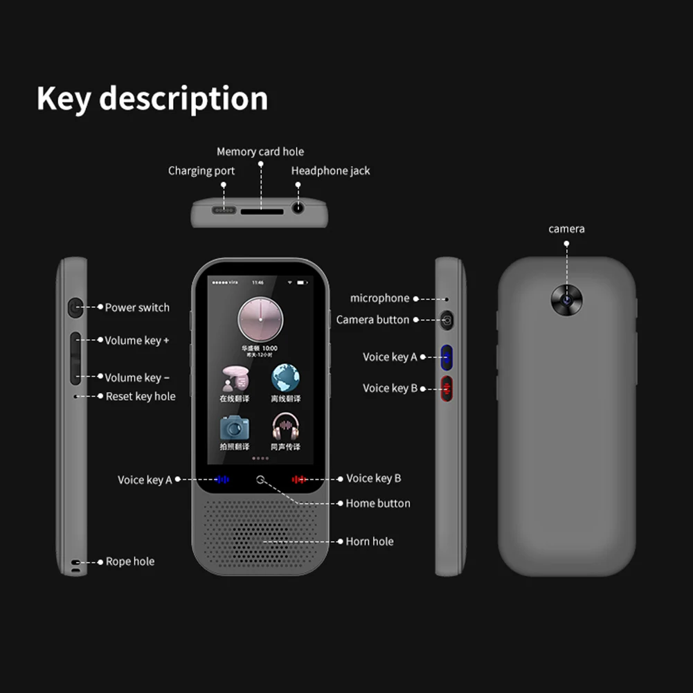 5.Diseño portátil y fácil de usar:El traductor inteligente portátil presenta un diseño compacto y liviano que cabe fácilmente en su bolsillo o mochila.La pantalla táctil HD de 3 pulgadas proporciona traducciones claras y fáciles de leer, lo que hace que este traductor de voz bidireccional en tiempo real sea una herramienta conveniente y práctica para el uso diario.