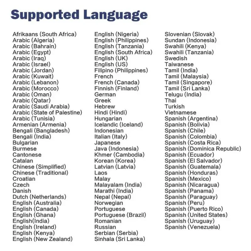 Chino, cantonés, inglés (EE. UU.), inglés (AU), inglés (Reino Unido), danés (DK), alemán (DE), español (ES), francés (FR), Italia (IT), japonés (JP) (KR), árabe (EG), polaco (PL), portugués (PT), ruso (RU), francés (CA), tailandés (TH), vietnamita, indonesio (ID) húngaro, mahogiano, serbio, croata y más.