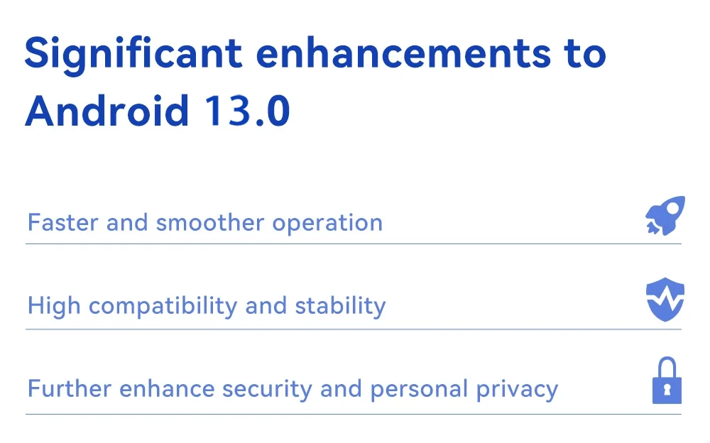 Último sistema Android 13,0, Protección mejorada de la privacidad del usuario.