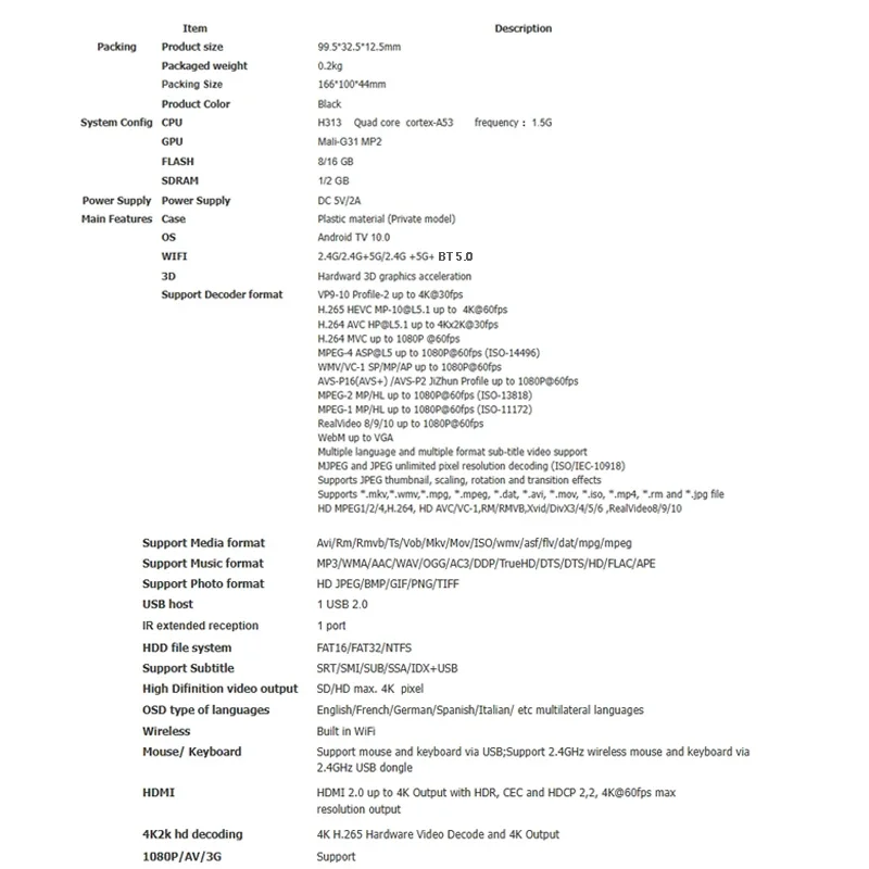 Funciones ricas, aplicaciones multifacéticas: funciona en el sistema operativo Android TV 10.0, compatible con una gran cantidad de aplicaciones y juegos, satisfaciendo sus diversas necesidades de entretenimiento.Admite WiFi de doble banda 2,4G/5G, conexión de red estable, admite Bluetooth 5.2, puede conectar periféricos.