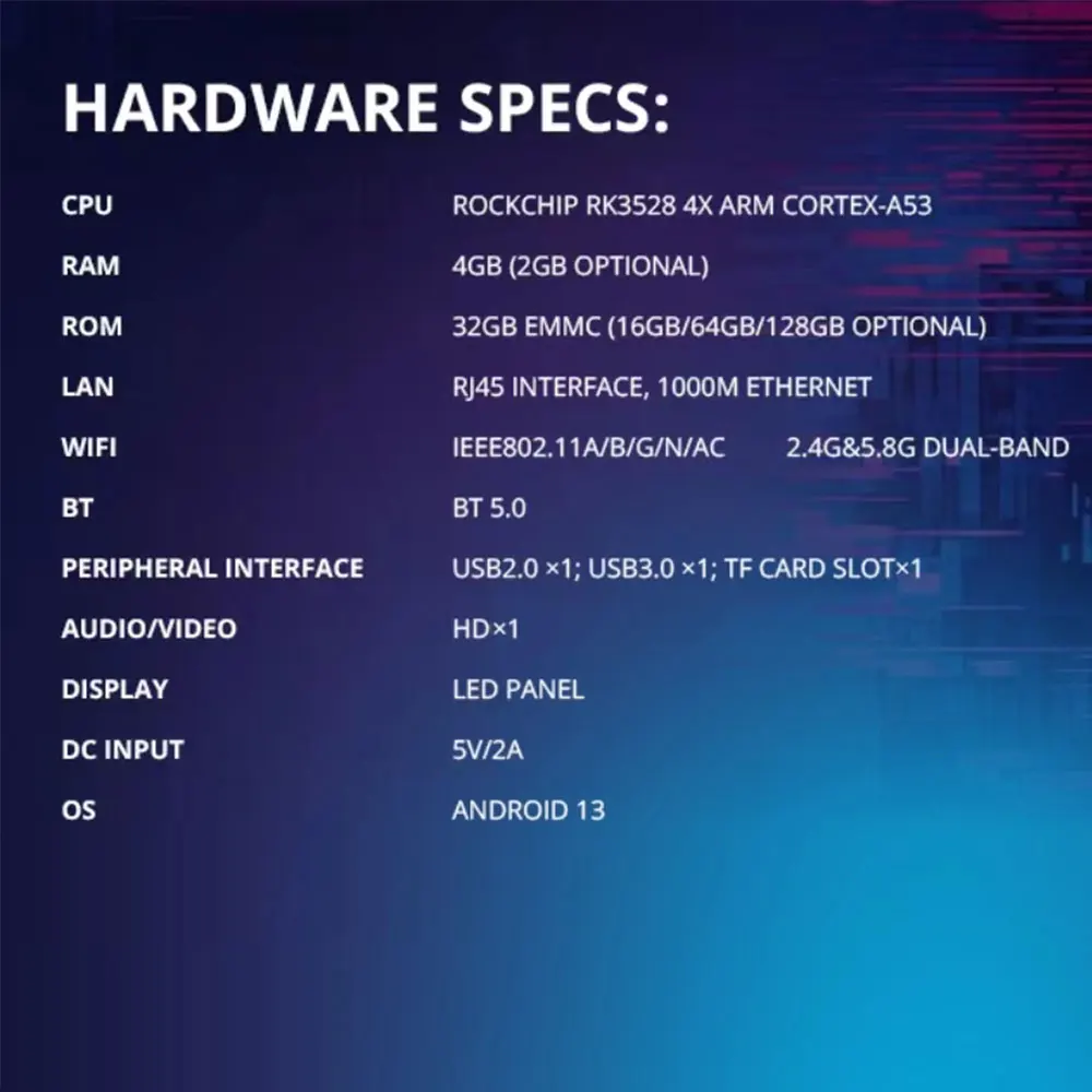 Destacados1, CPU: Rockchip RK3528Quad Core ARM (brazo de cuatro núcleos), (brazo de dos núcleos).
