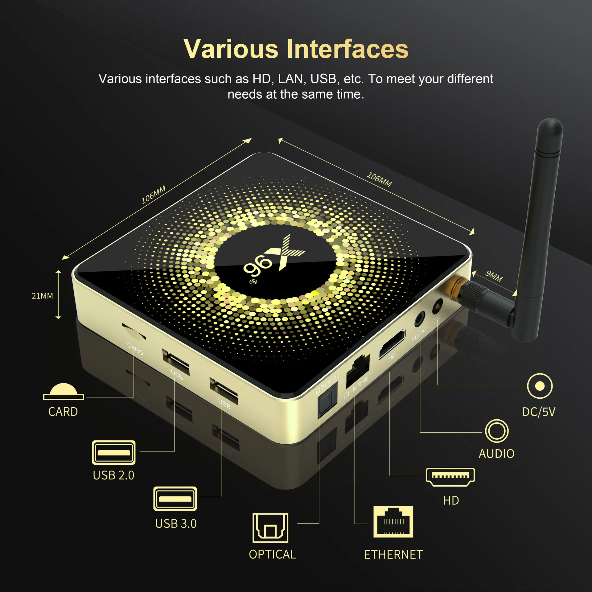 X96 X10 Amlogic S928X TV Box 8GB RAM 64GB ROM Soporte 8K USB3.0 Wifi6 BT5.2 1000M LAN Google Voice Input Set Top Box Media Player X96X10 4G 32G1. CPU: ARM Amlogic S928X de núcleo grande y brazo cuádruple de núcleo grande, 1. 2. 1. 1.