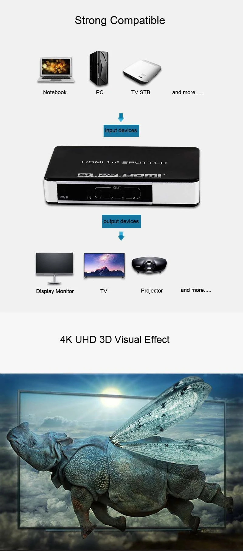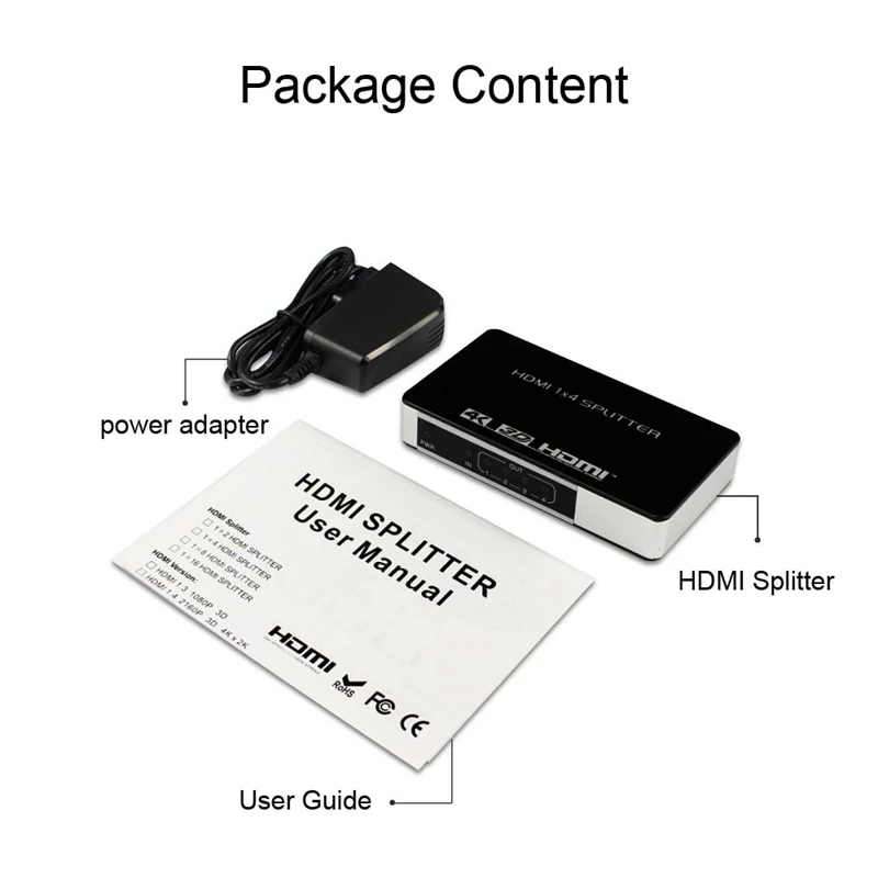 Este divisor HDMI es un producto que puede distribuir una señal HDMI vía de 1 a 4 dispositivos terminales de pantalla sin ninguna pérdida de calidad.