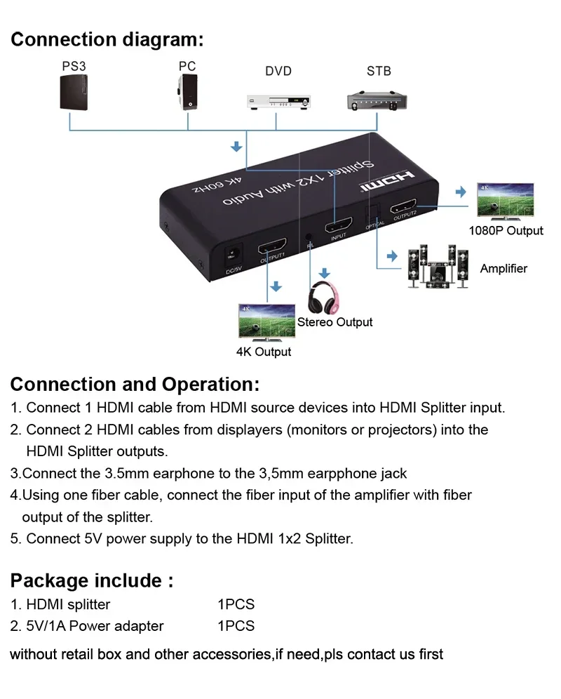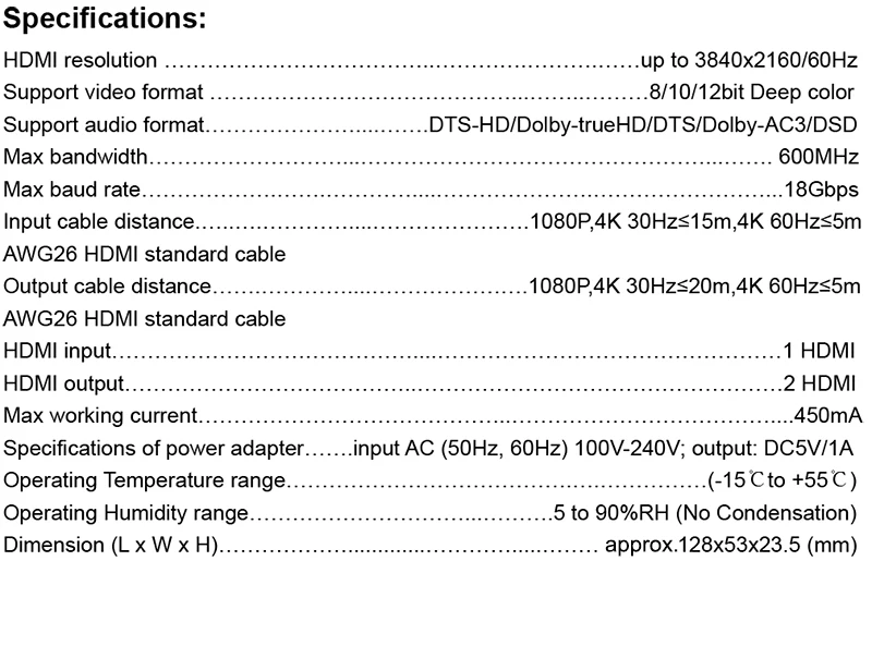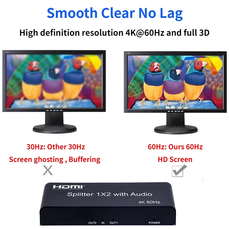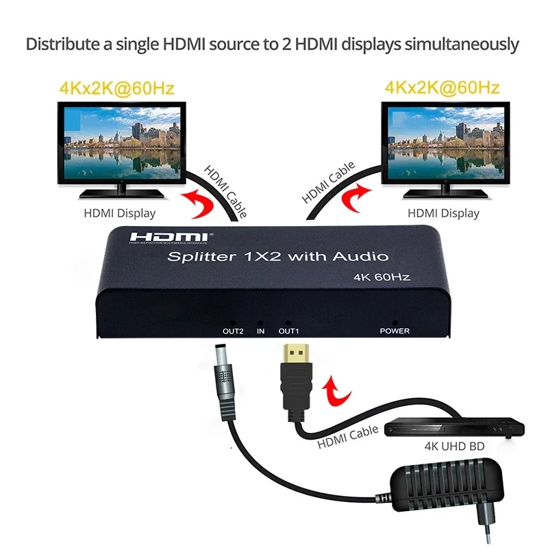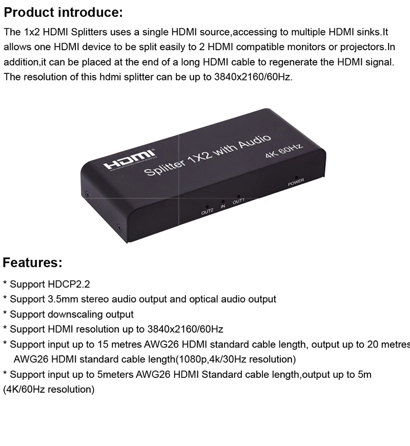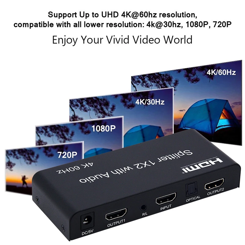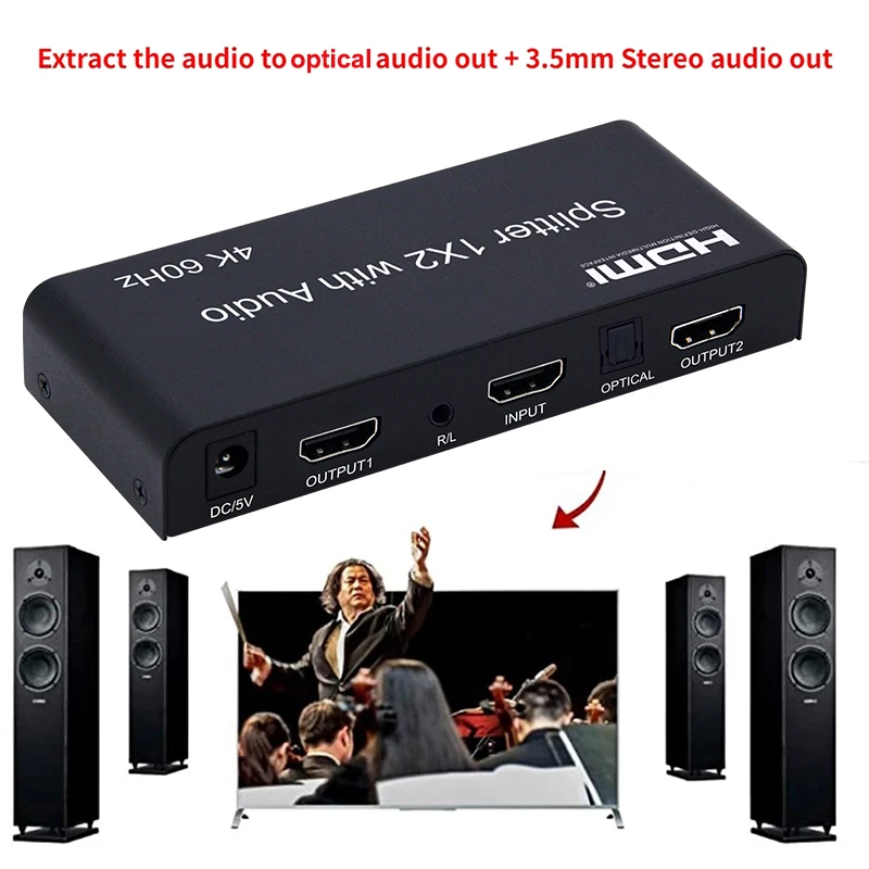 Divisor 4K 60Hz HDMI 2,0 1x2 con Spdif óptico 3,5mm, Extractor de Audio, convertidor de vídeo para cámara, TV Box, ordenador portátil, PC a Monitor de TV