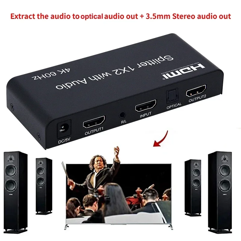 Comprar Divisor 4K 60Hz HDMI 2,0 1x2 con Spdif óptico 3,5mm, Extractor de Audio, convertidor de vídeo para cámara, TV Box, ordenador portátil, PC a Monitor de TV