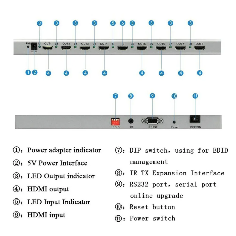 8. Admite HDMI una sola fuente, accediendo a múltiples sumideros HDMI, la fuente puede ser REPRODUCTOR DE DVD, decodificador de TV, PC,etc.