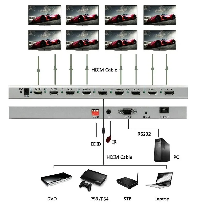 8. Admite HDMI una sola fuente, accediendo a múltiples sumideros HDMI, la fuente puede ser REPRODUCTOR DE DVD, decodificador de TV, PC,etc.