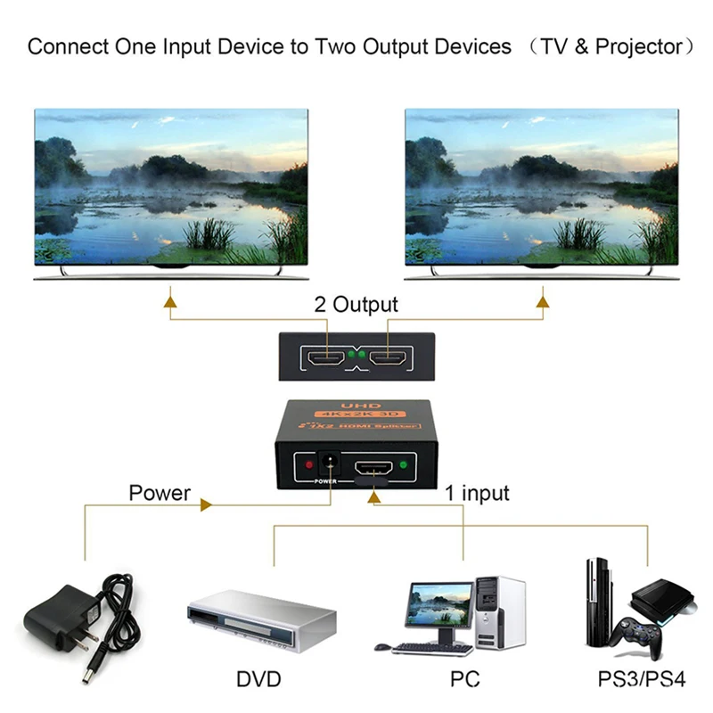 Divisor 4K UHD 3D compatible con HDMI Splitter HD 1X2 1080P Switch Split 1 en 2 out Switcher Repetidor para HDTV DVD PS3/4 Xbox PC