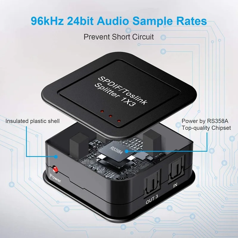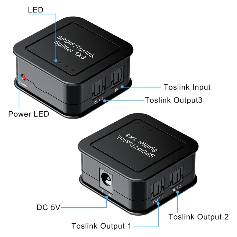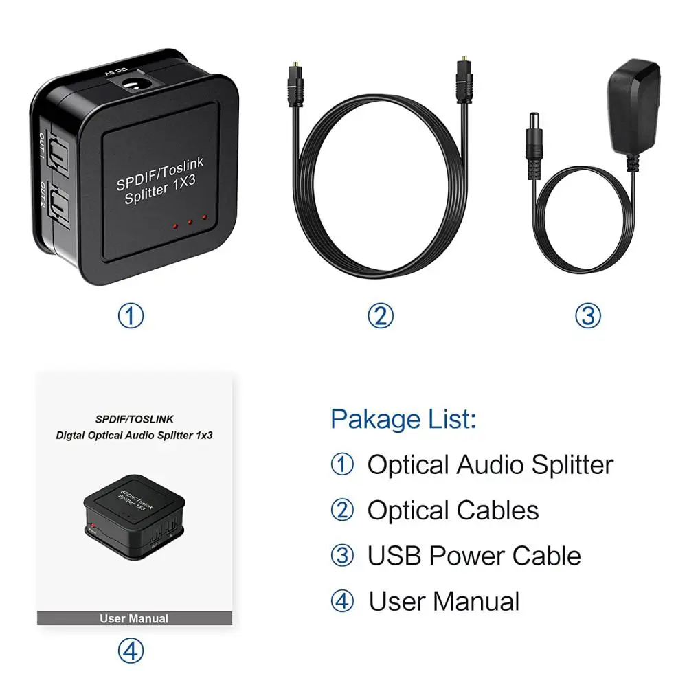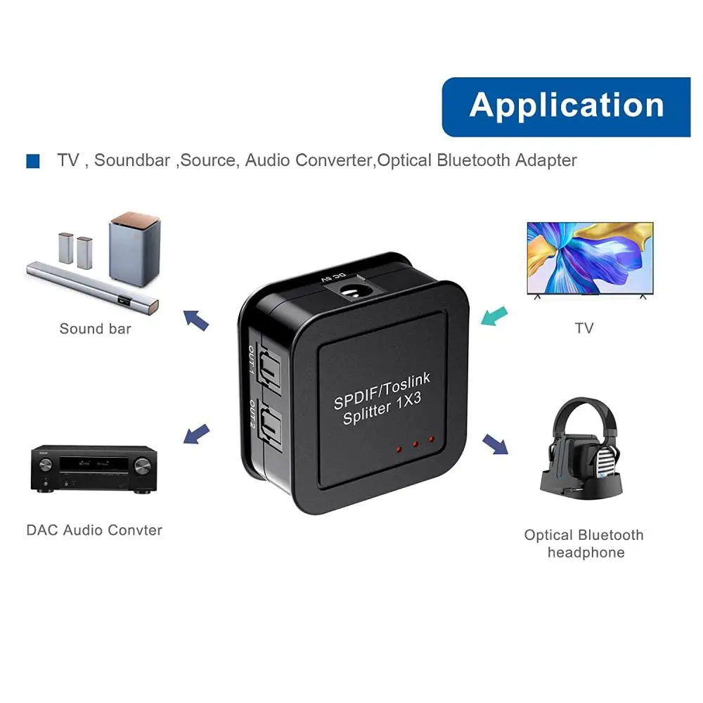 1. Divisor de fibra óptica digital 1x3: Divisor de señal de fibra óptica para tres juegos de SPDIF/slink/equipo de recepción de señal óptica. Con adaptador de corriente, plug and play.