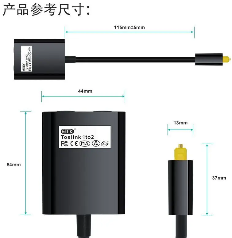 IntroducciónEl divisor Adaptador de audio de fibra óptica le permite conectar una fuente de audio óptica y dividirla en dos señales claras a través de este divisor de fibra Nota: Admite 1 entrada macho a 2 salidas hembra al mismo tiempo; Si 2 entradas hembra a 1 salida macho, debe apagar un dispositivo de entrada hembra, 2 entradas hembra no pueden funcionar al mismo tiempo, o interferirán y causarán ruido Ideal para conectar su reproductor de CD/DVD u otra fuente de audio digital al receptor y la grabadora, ahorra en el desgaste constante de enchufar y desenchufar cables de fibra óptica. La interfaz 24K Gold adoptada, la fibra óptica de baja pérdida, la fibra sintética de baja fluctuación y la interfaz de metal brindan una excelente experiencia de calidad de sonido. Divisor de fibra óptica digital Toslink Cable de audio de 1 en 2 salidas, para CD/DVD/PS3/PS4/Xbox 360/Xbox One S. El paquete incluye: 1 divisor de fibra óptica