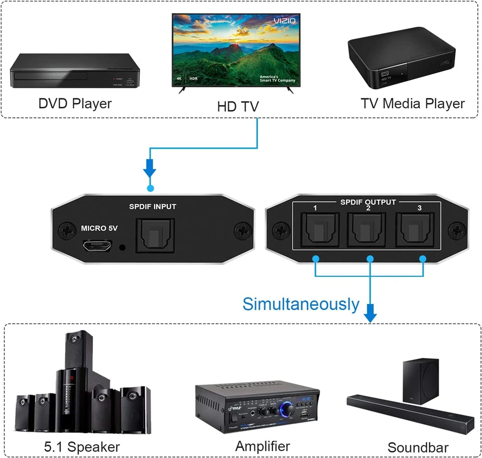 1. Una forma de divisor de entrada de señal de fibra óptica a tres conjuntos de dispositivo receptor de señal SPDIF/TosLink.