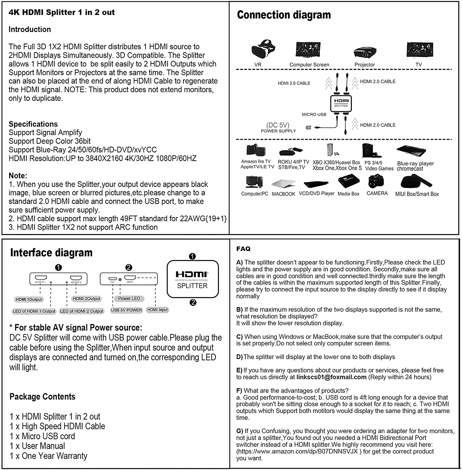 PAQUETE INCLUIDO-1 * [divisor compatible con 1 en 2 salidas HDMI], 1 * [cable USB (adaptador de corriente USB no incluido, conecte el USB a un enchufe de pared, no es una caja de cable, etc. ..)], 1 * Cable compatible con HDMI de alta velocidad(Opcional)...