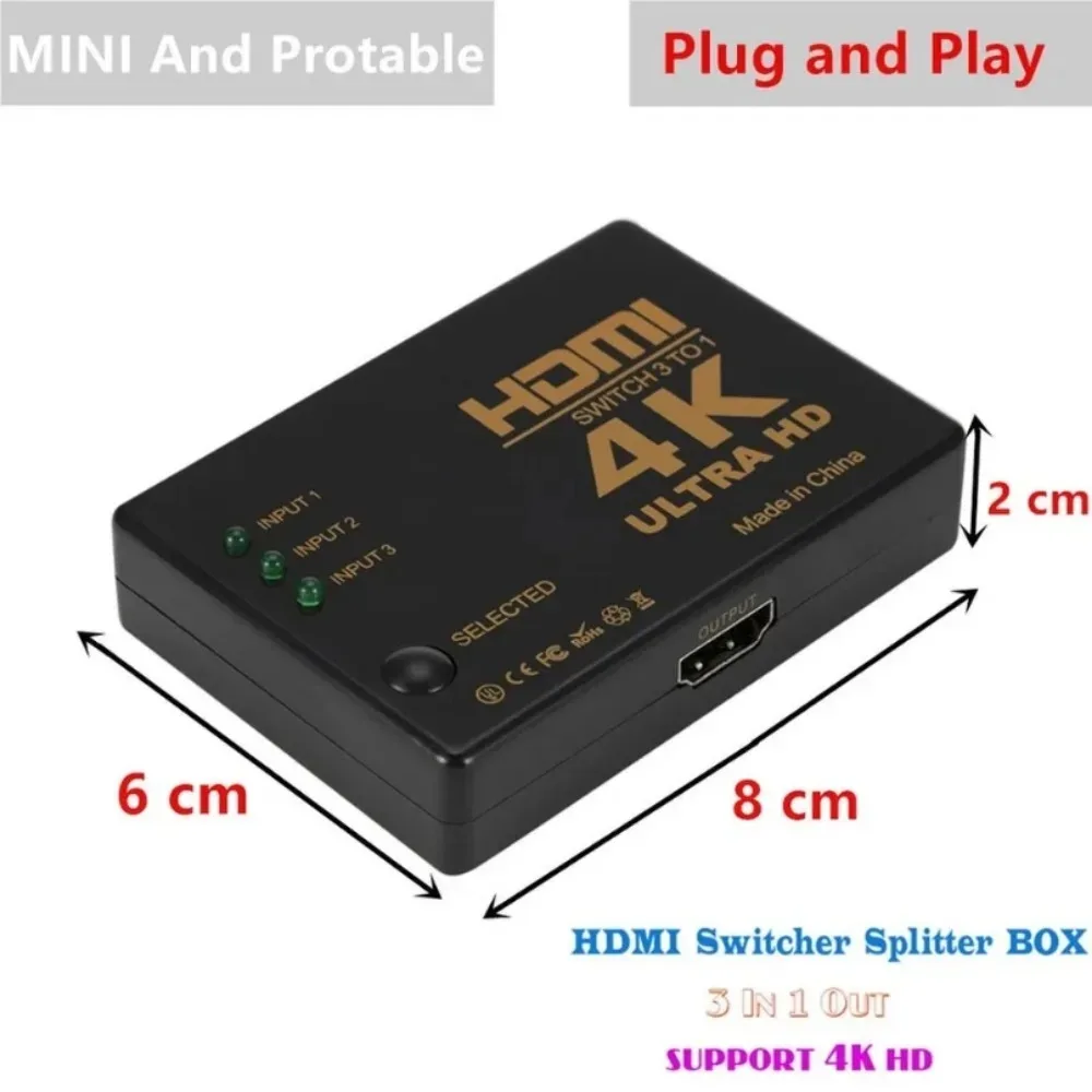 Divisor compatible con HDMI 3x1, adaptador de conmutador de vídeo HD 1080P, 3 Entradas, 1 puerto de salida, concentrador HDMI para Xbox PS4, DVD, HDTV, PC, portátil, TV