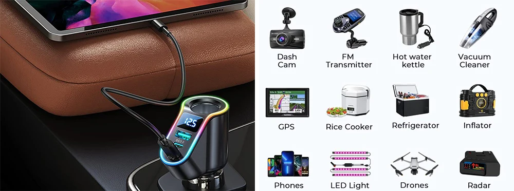 4. 【Cargador de coche universal y amplia compatibilidad】El enchufe de coche de 12V se adapta perfectamente a su GPS, cámara de salpicadero, aspiradora, nevera de coche, asientos con calefacción, navegación por satélite, etc. (No se recomienda que la potencia de un solo enchufe exceda los 80W). El Puerto USB es compatible con su nuevo iPhone 14 Pro Max/14 Pro/14 Plus/14/iPhone 13 Pro Max/ iPhone 13 Pro/ iPhone 12/11/10/XR/XS, samsung Galaxy S22 Ultra/Samsung S21 Ultra/S20 Note 20/10 A52 A71 A51 A10E S9 S9, Google Pixel 6 pro/6/5. Compatible con coches de 12-24V, camiones, RV, etc.