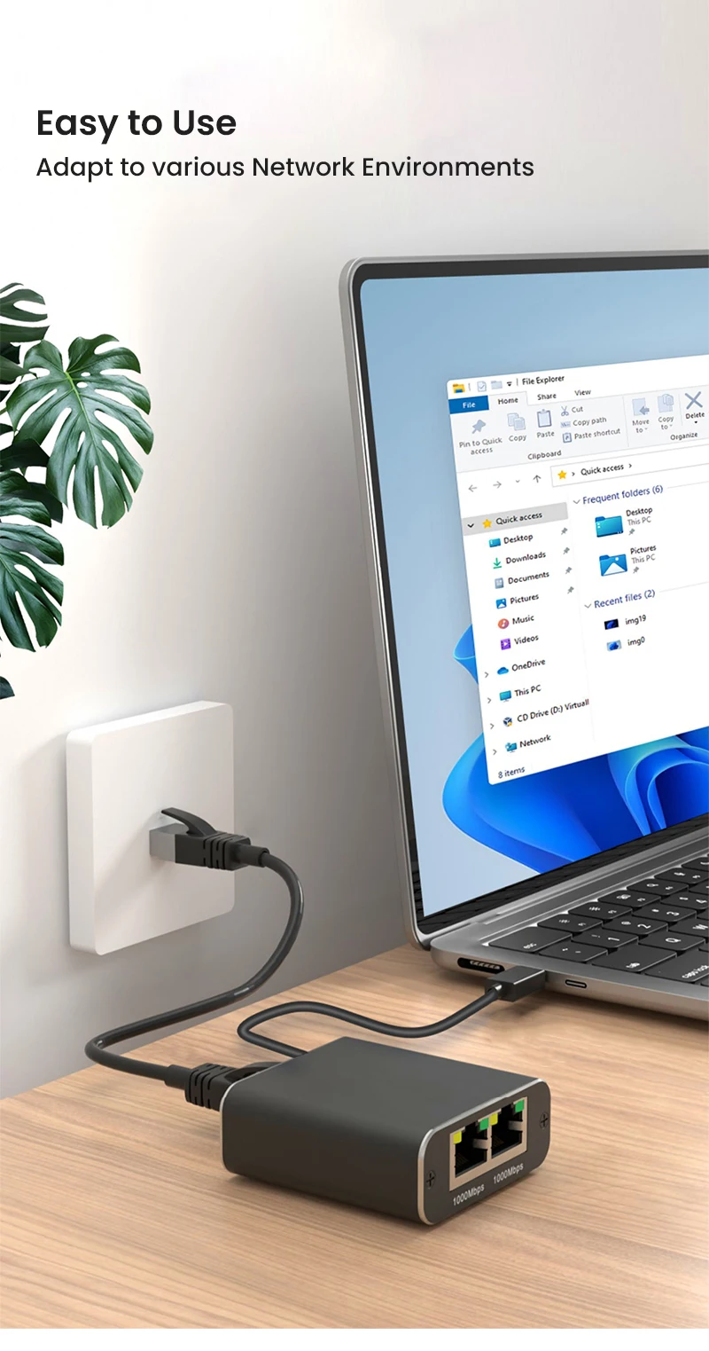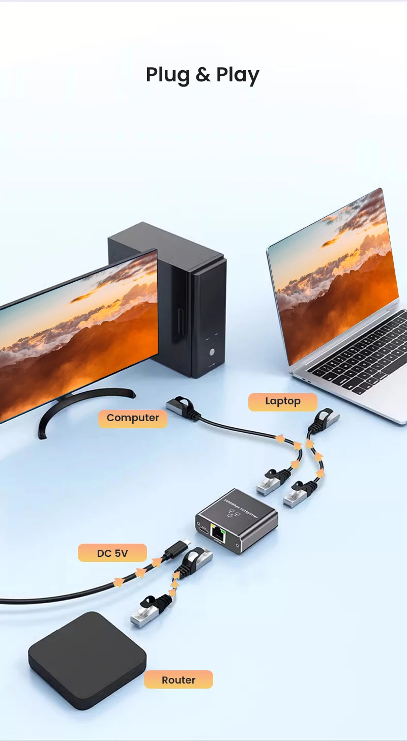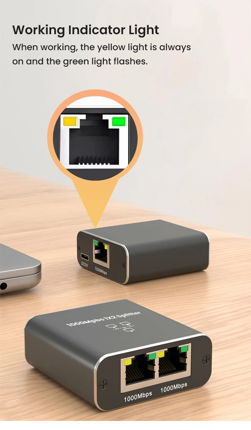 Este divisor Gigabit Ethernet está diseñado específicamente para abordar problemas de conexión causados por cableado insuficiente.Alimentado por un cable USB incluido, este dispositivo admite dos computadoras que comparten una única línea Ethernet simultáneamente, lo que lo convierte en un distribuidor de red simple pero eficiente.Ofrece una solución conveniente para ampliar su red.