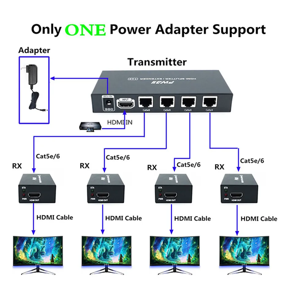 El extensor HDMI proporciona extensión de señales HDMI a largas distancias a través de un solo cable CAT6, transforma una entrada de canal a salida de 4 canales, admite alta resolución de hasta 1080p. El extensor se puede utilizar para una amplia gama de aplicaciones que requieren transmisión a larga distancia de alta resolución con alta calidad por su buena estabilidad y potente seguridad.